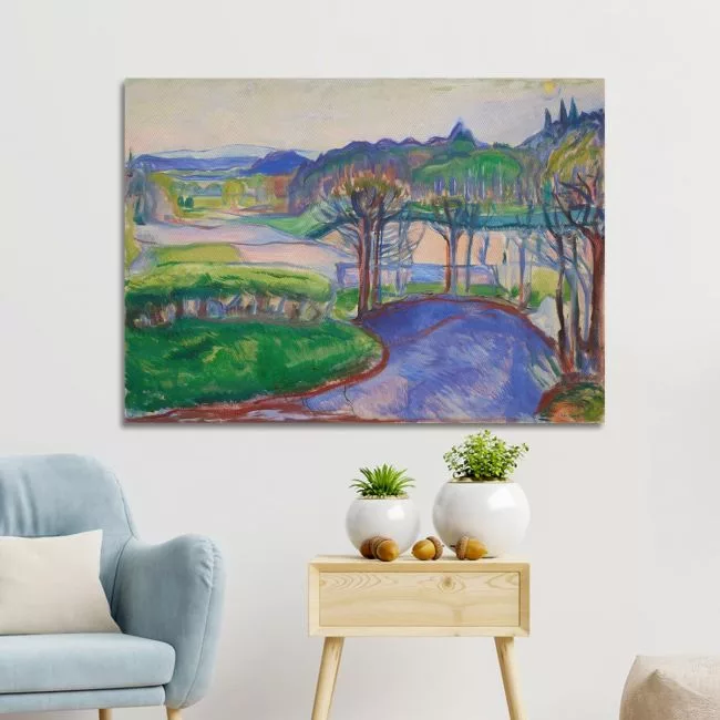 Το έργο "Spring Landscape" (1912) ανήκει στην ύστερη περίοδο του Munch, όπου ο καλλιτέχνης στράφηκε σε πιο φωτεινά χρώματα και τη φύση, αφήνοντας πίσω τις σκοτεινές υπαρξιακές αναζητήσεις.