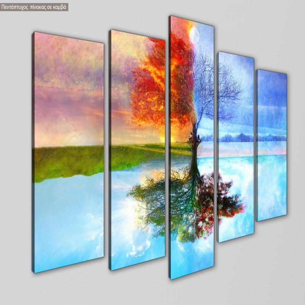 Πίνακας σε καμβά Four season tree with moon, πεντάπτυχος