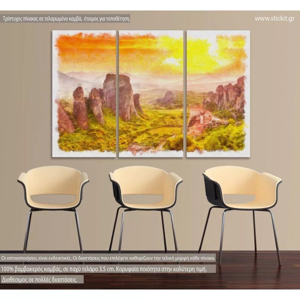 Πίνακας σε καμβά Meteora at sunset watecolor, τρίπτυχος