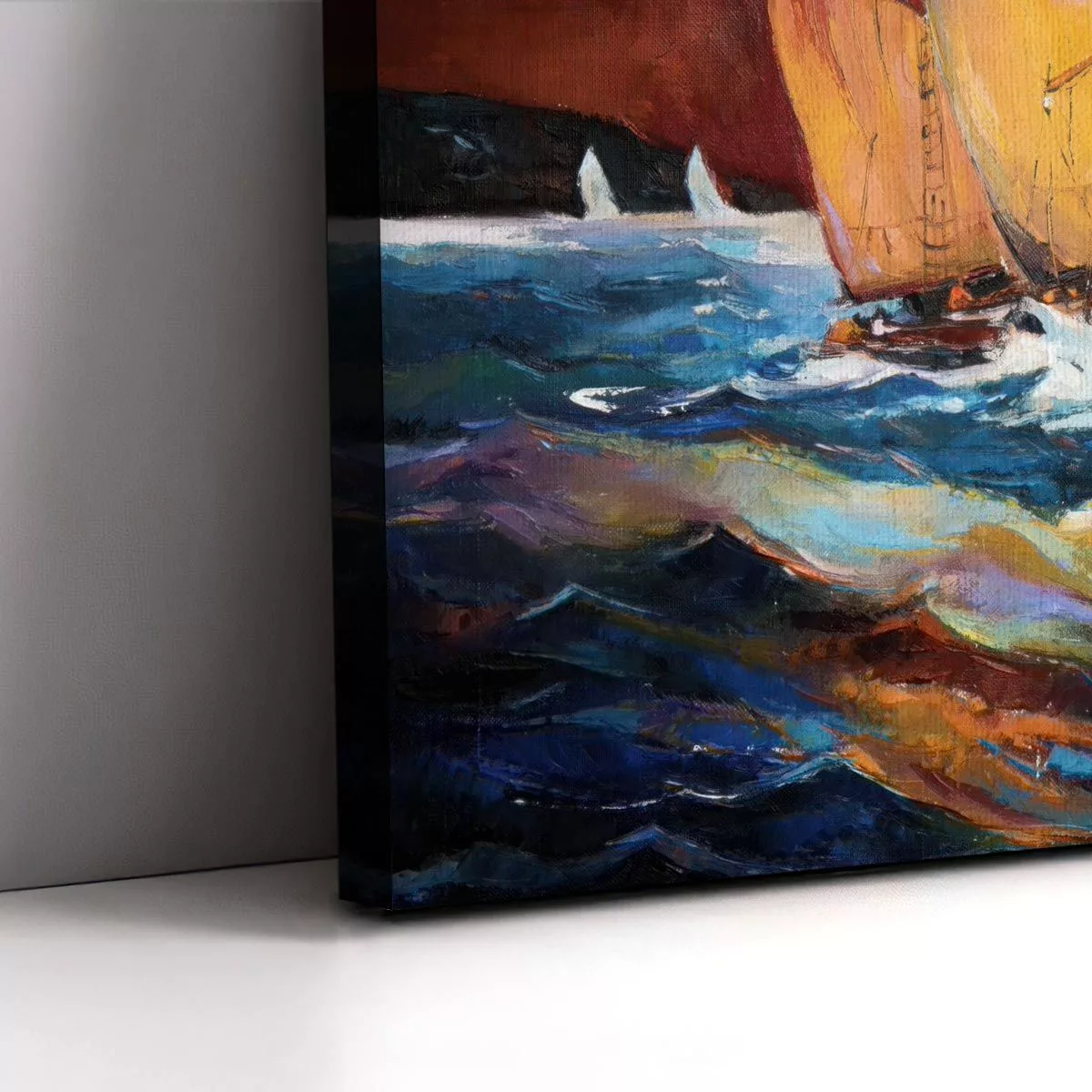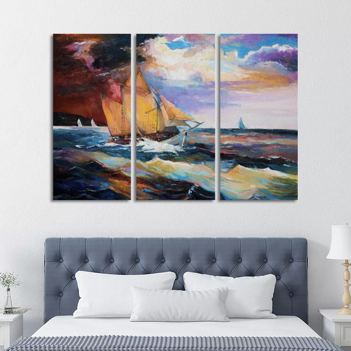 Τρίπτυχος καμβάς με δυναμική απεικόνιση ιστιοπλοϊκού σε φουρτουνιασμένη θάλασσα.