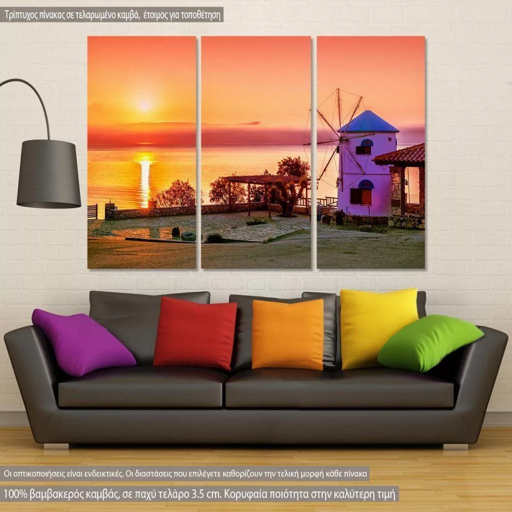 Πίνακας σε καμβά Ζάκυνθος, Traditional windmill against sunrise, Zakynthos, τρίπτυχος