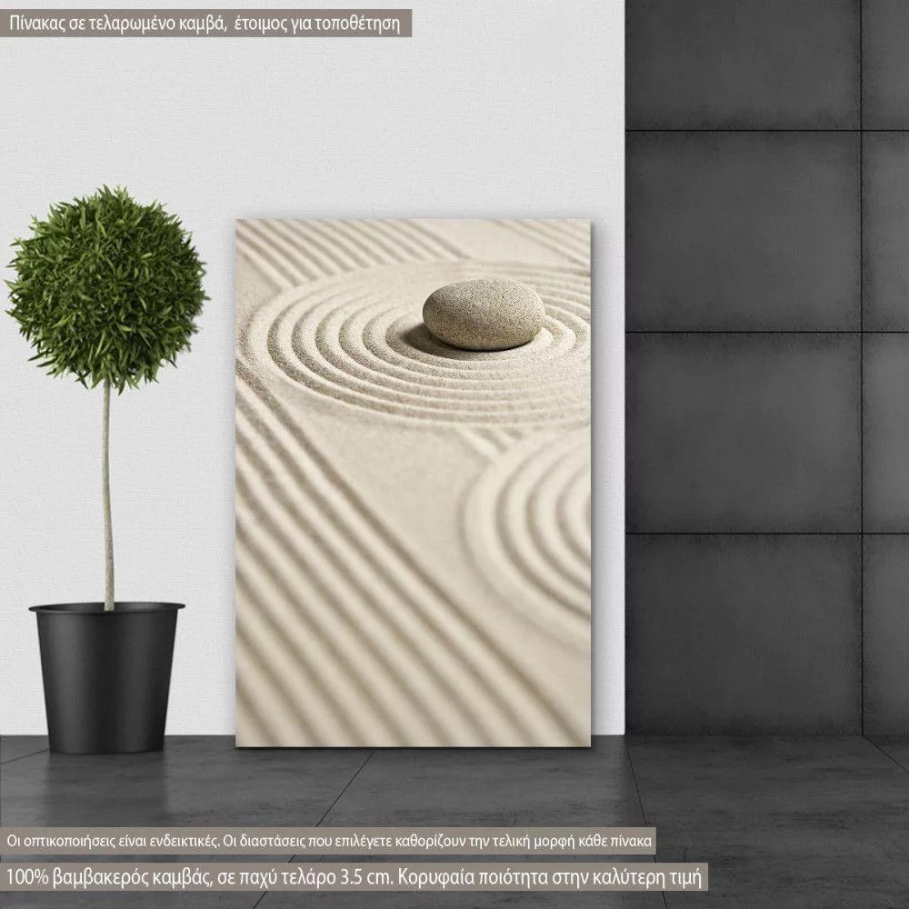 Ένας κάθετος πίνακας που αποτυπώνει την απόλυτη ηρεμία. Η σύνθεση με την πέτρα Zen και την άμμο δημιουργεί ένα σημείο εστίασης που εμπνέει γαλήνη και ισορροπία.