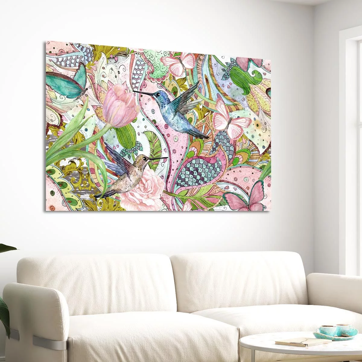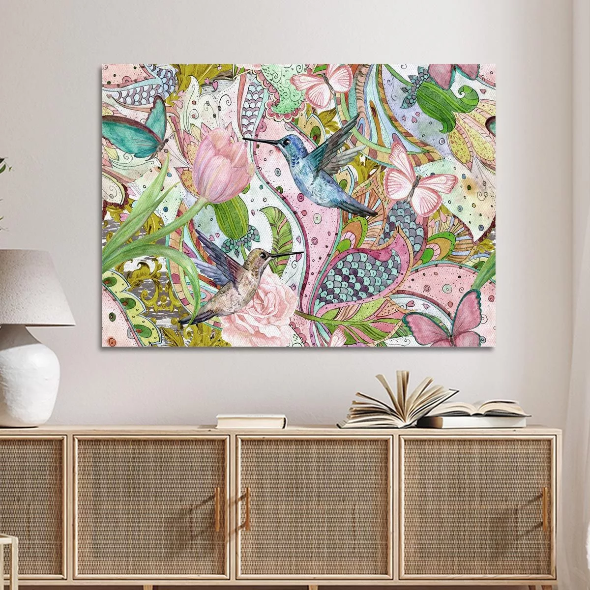 Πίνακας σε καμβά Flowers, hummingbirds and butterflies