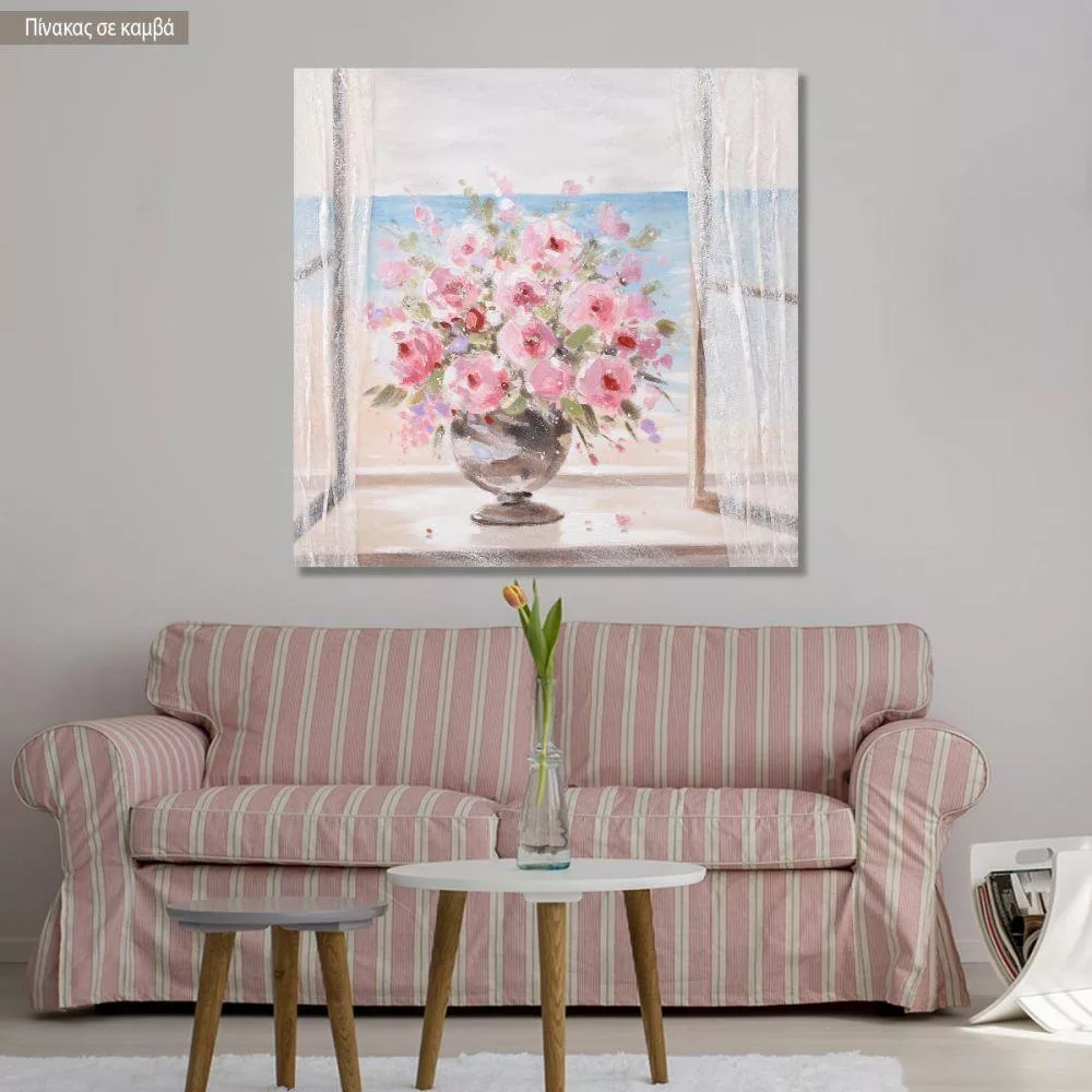 Πίνακας σε καμβά Pink roses in a vase by the window