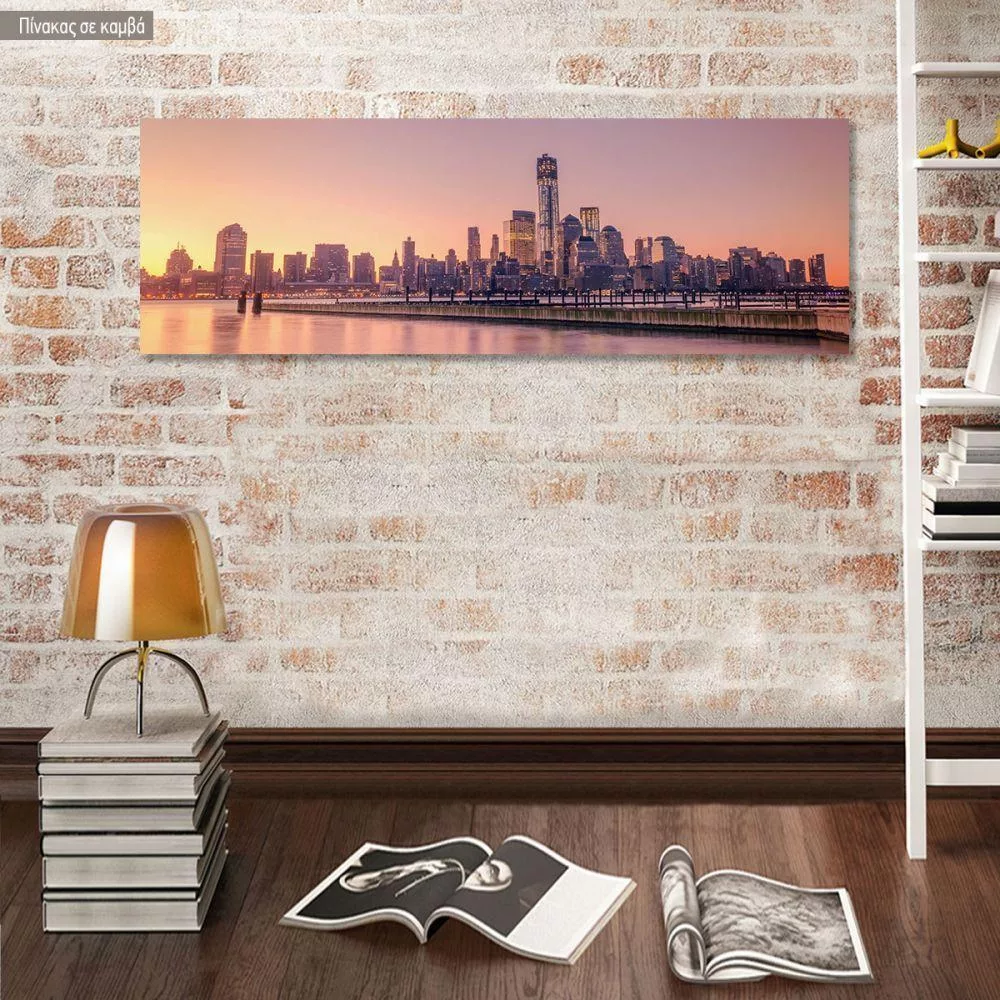Πίνακας σε καμβά New York city skyline, pink sunset, πανοραμικός