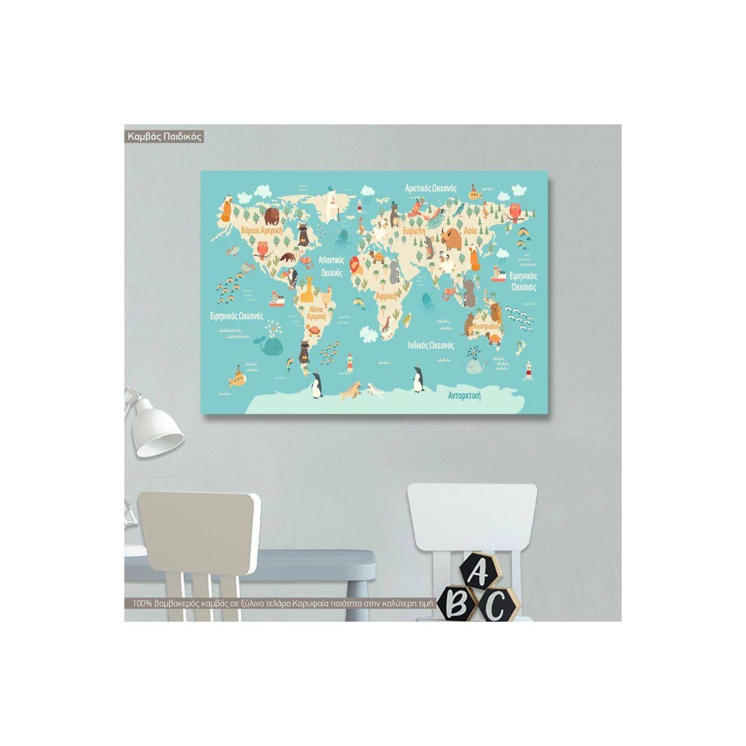 Πίνακας παιδικός σε καμβά Προσφορά 40x30 cm, Χάρτης με ζωάκια κάθε ηπείρου