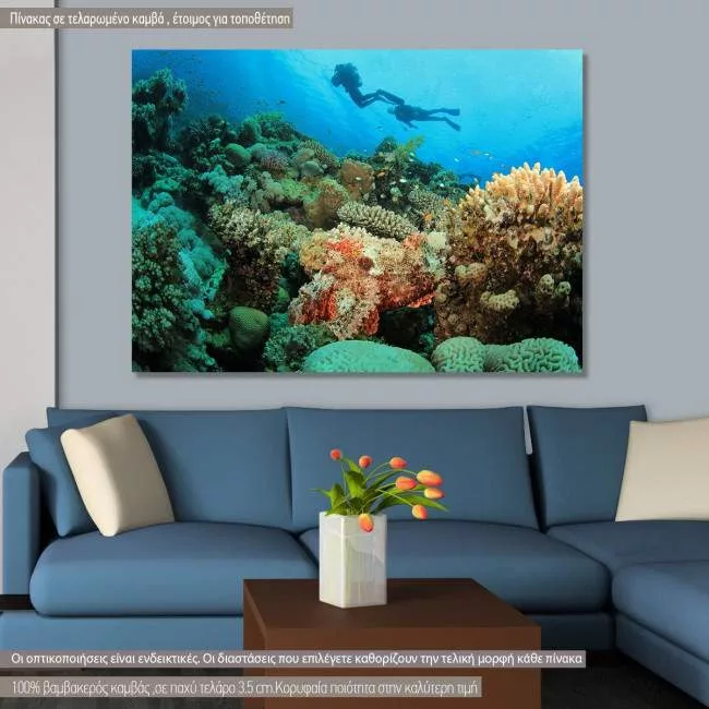 Πίνακας σε καμβά Coral reef, scorpionfish and scuba divers