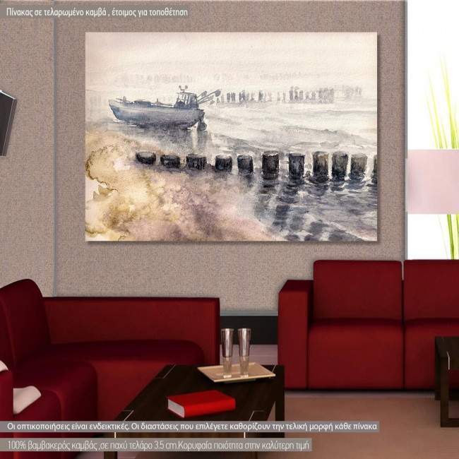 Πίνακας σε καμβά Ψαρόβαρκα, Fishing boat moored during fog