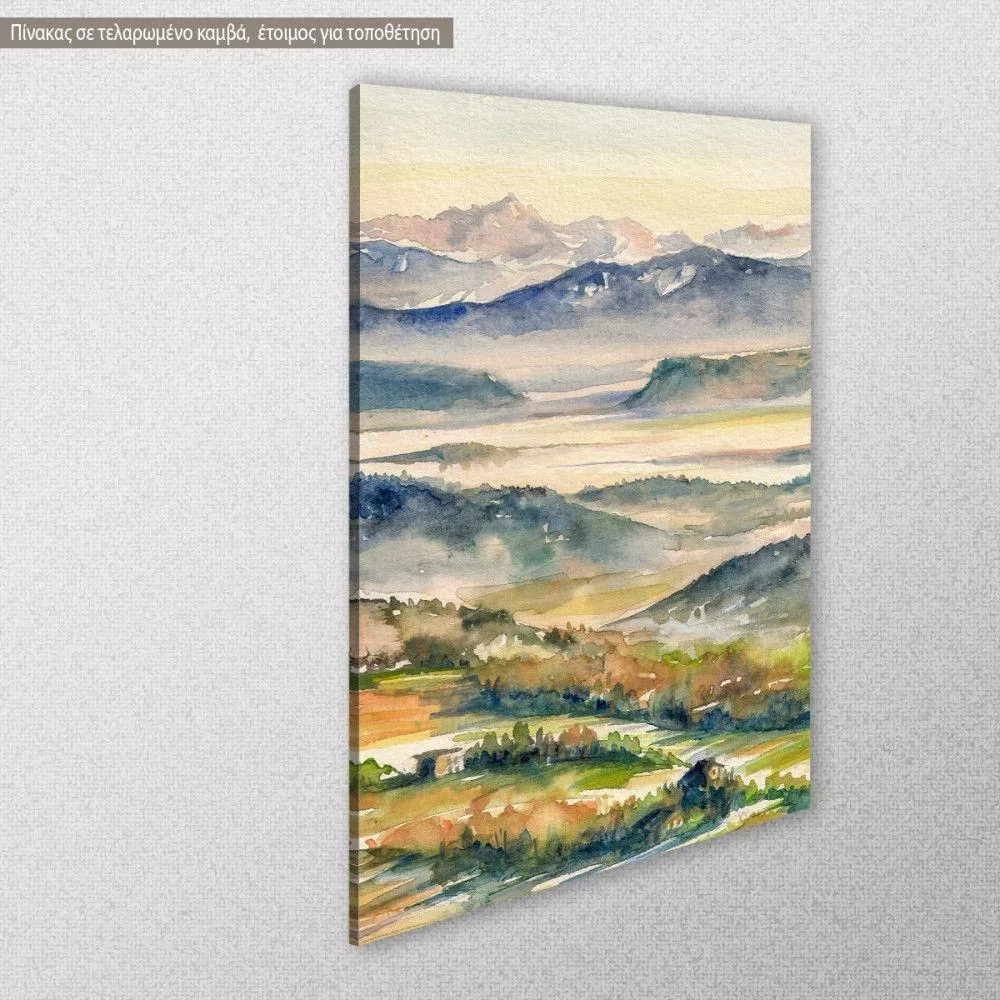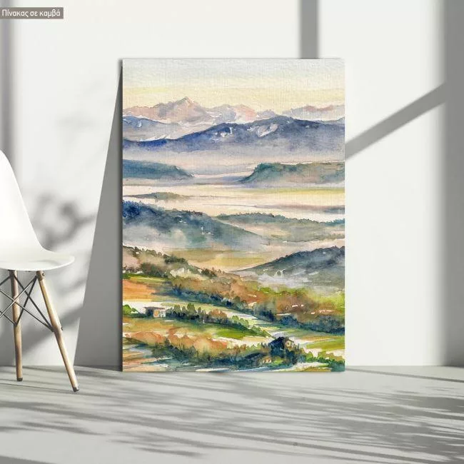 Πίνακας σε καμβά Τοπίο λόφοι, Hills and river in the mist