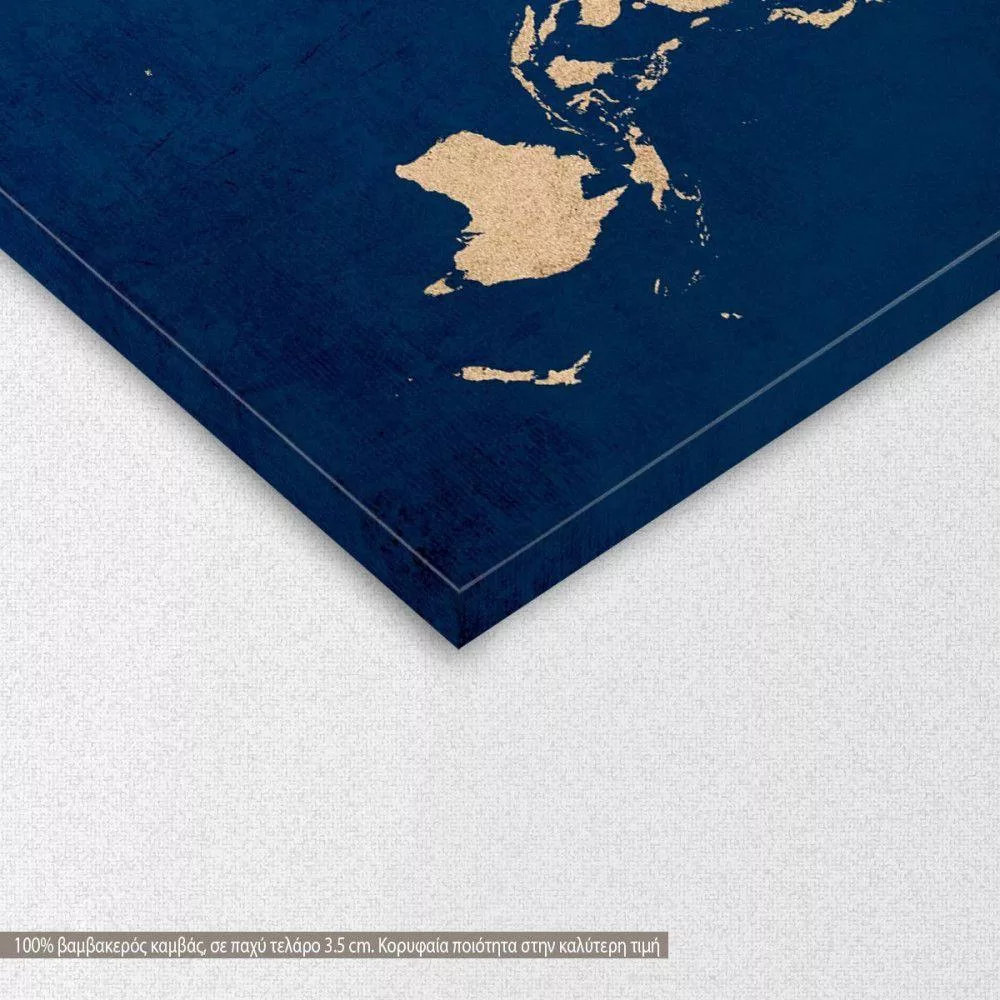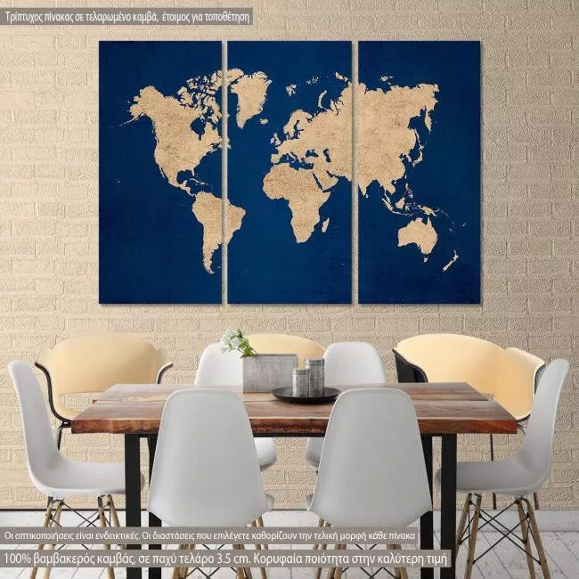 Πίνακας σε καμβά παγκόσμιος χάρτης, σκούρο μπλε, μπεζ, τρίπτυχος