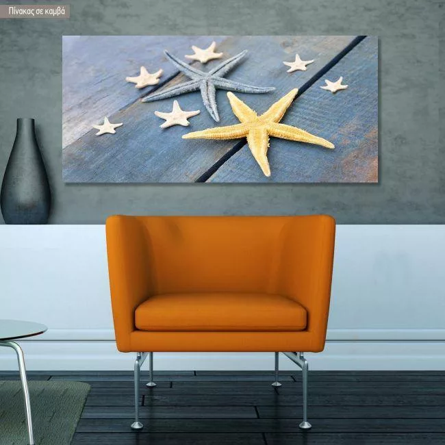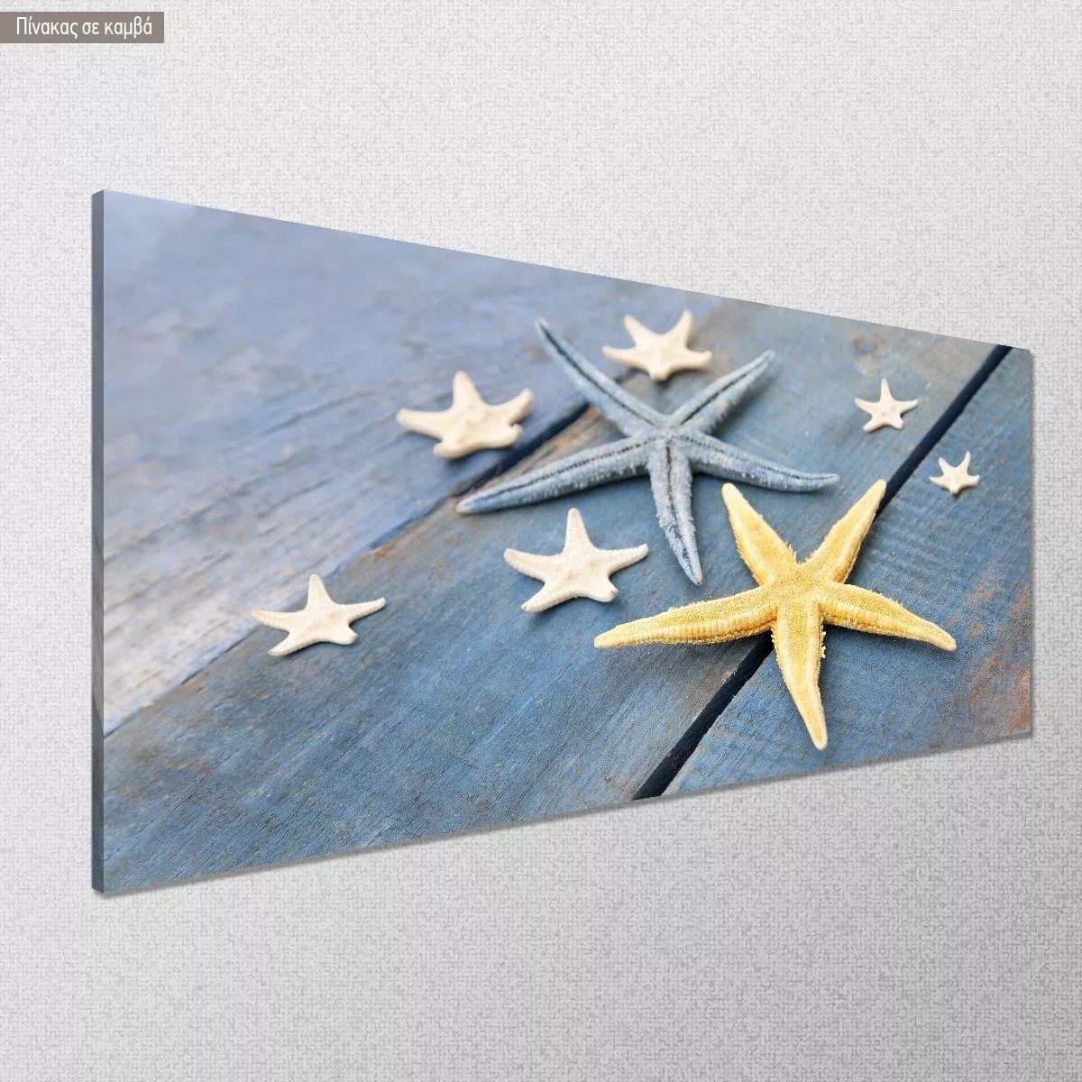 Πίνακας σε καμβά Group stars on blue wood, πανοραμικός