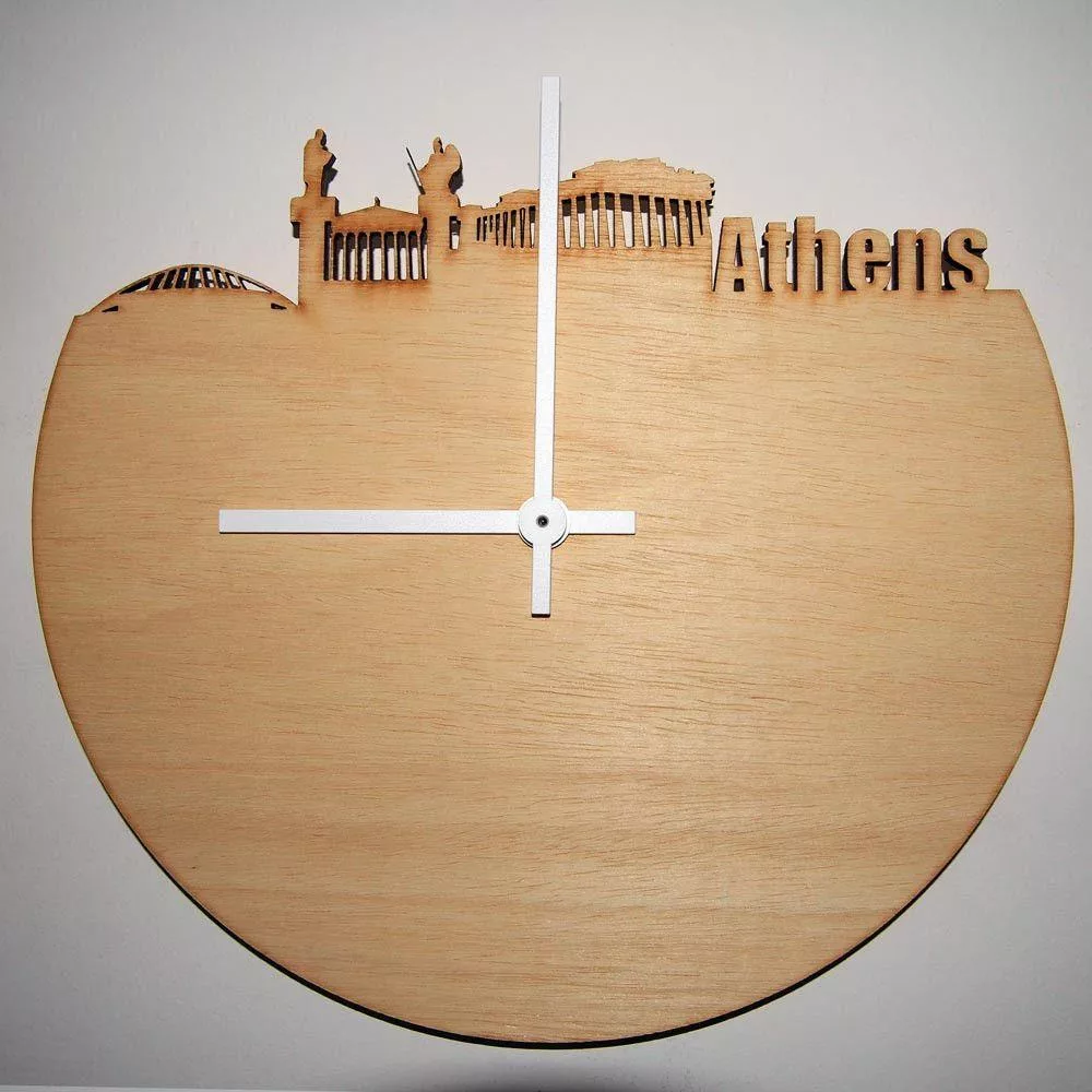 Ένα μοντέρνο ρολόι τοίχου με τον Παρθενώνα , την βιλιοθήκη και άλλα σημεία αναφοράς της Αθήνας.