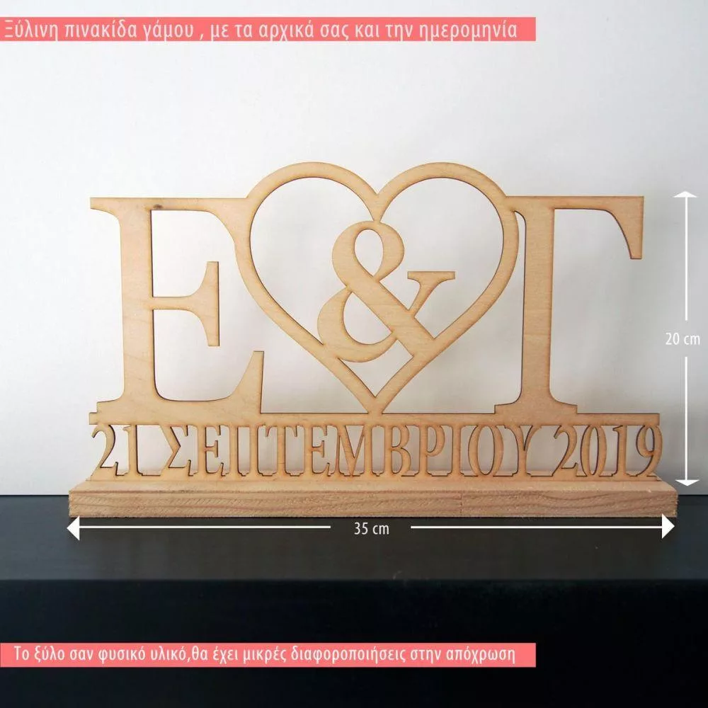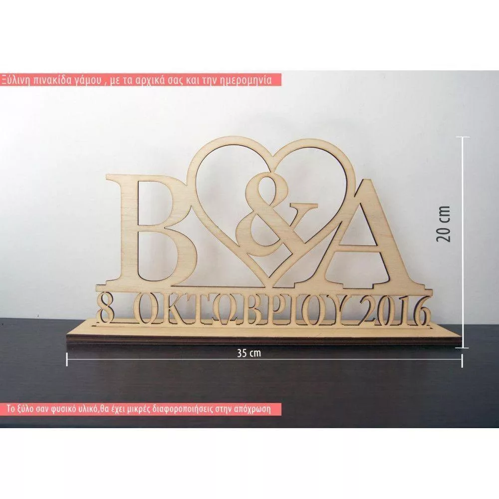 Ξύλινη πινακίδα γάμου με αρχικά και ημερομηνία