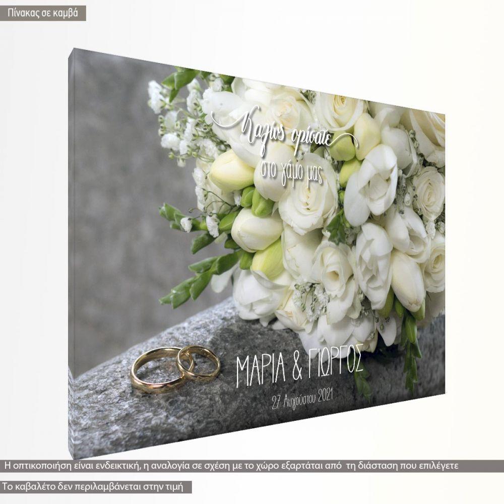 Καλωσόρισμα γάμου πίνακας, Μπουκέτο λουλουδιών I, βέρες, ονόματα, ημερομηνία
