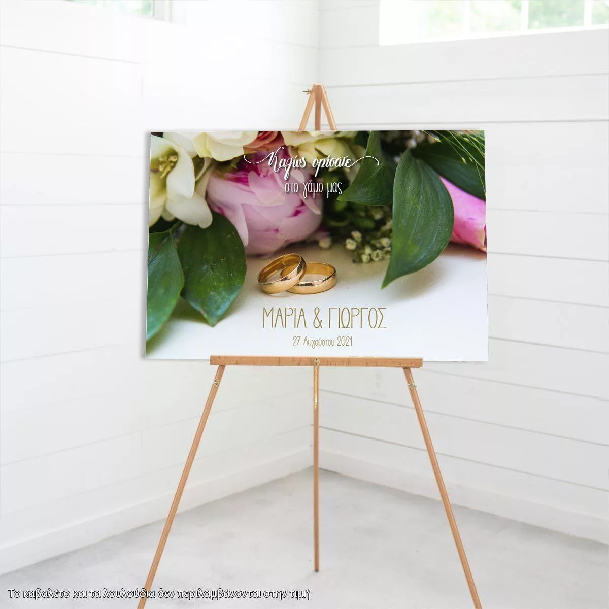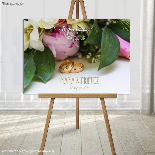 Καλωσόρισμα γάμου πίνακας, Μπουκέτο λουλουδιών II, βέρες, ονόματα, ημερομηνία