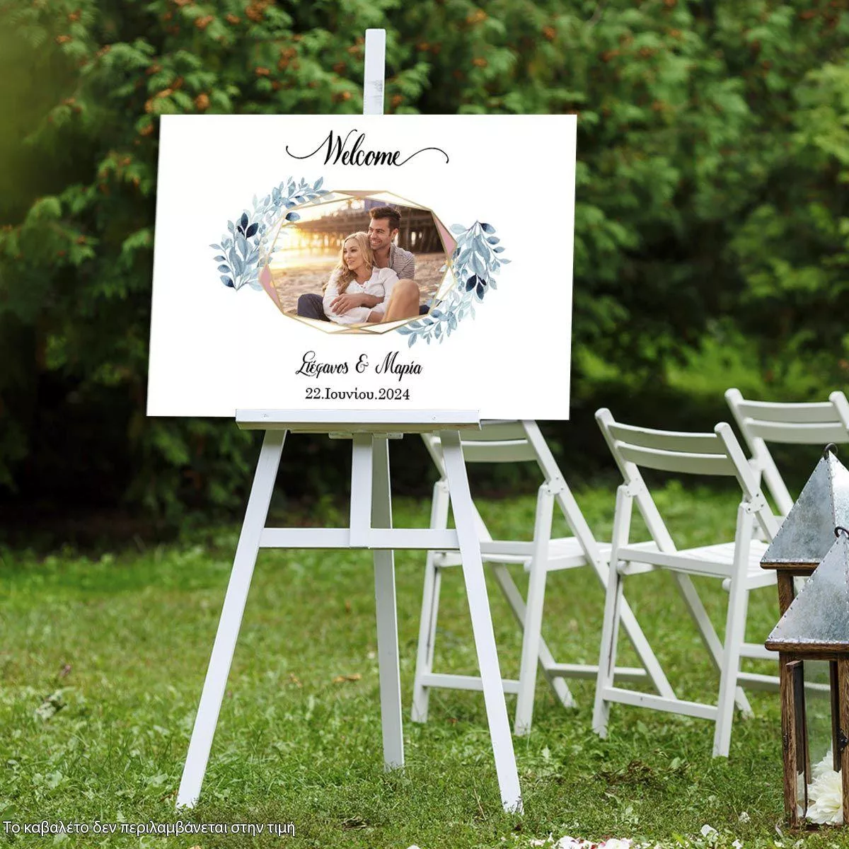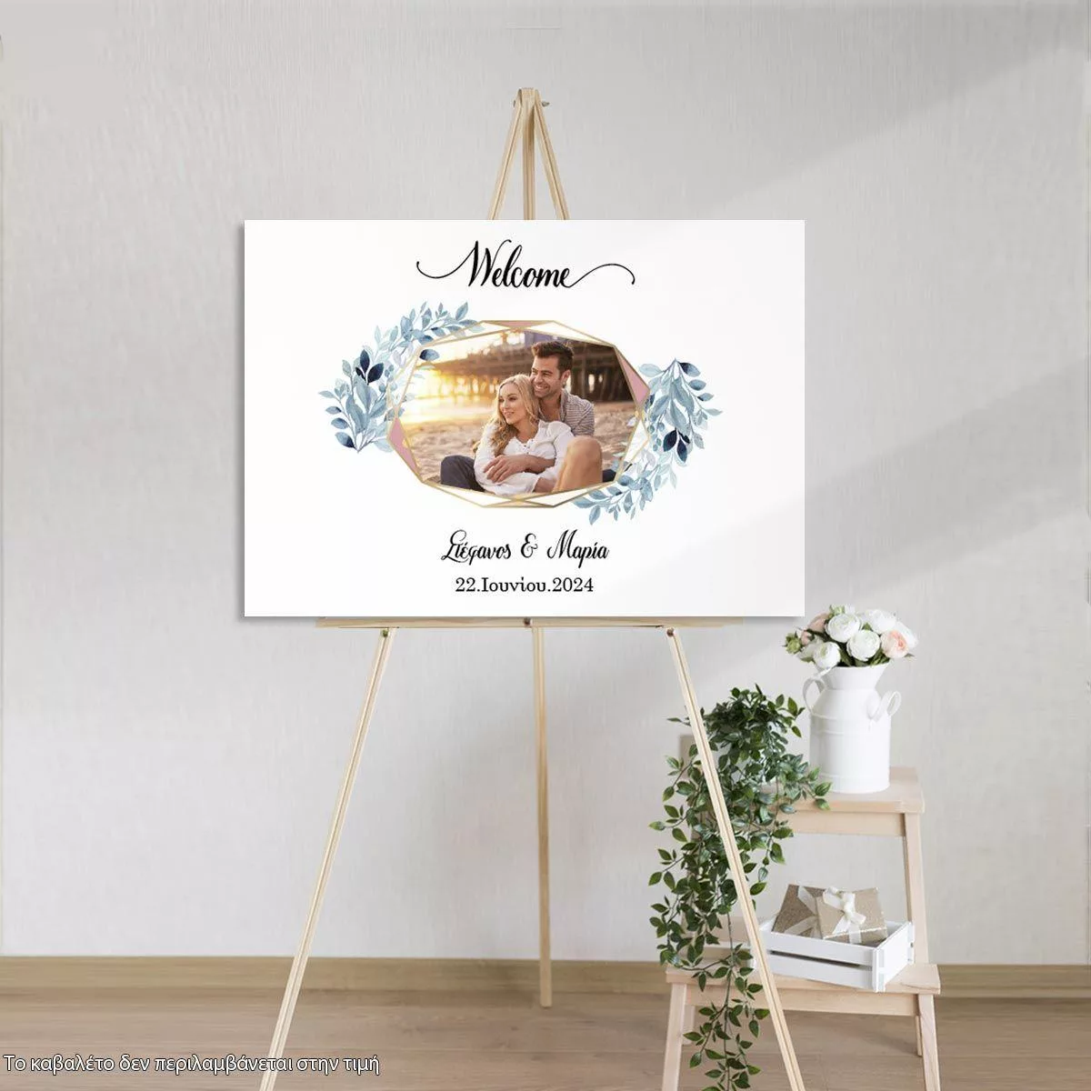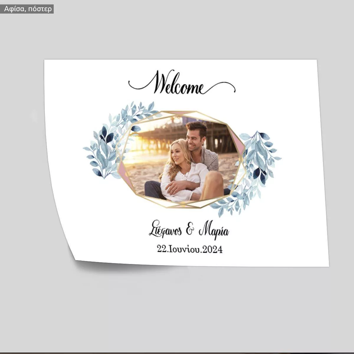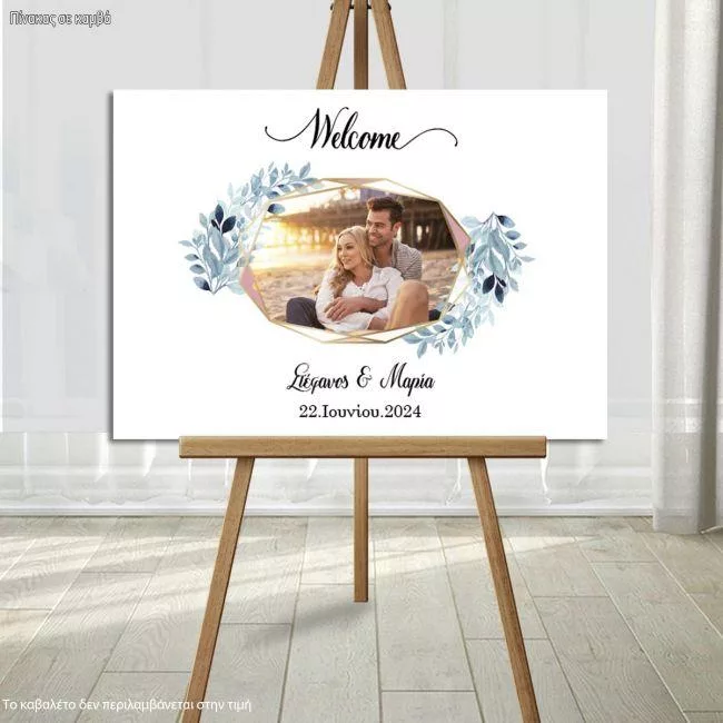 Πίνακας καλωσόρισμα γάμου, ευχολόγιο, Γεωμετρικό πλαίσιο μπλε λουλούδια, με φωτογραφία