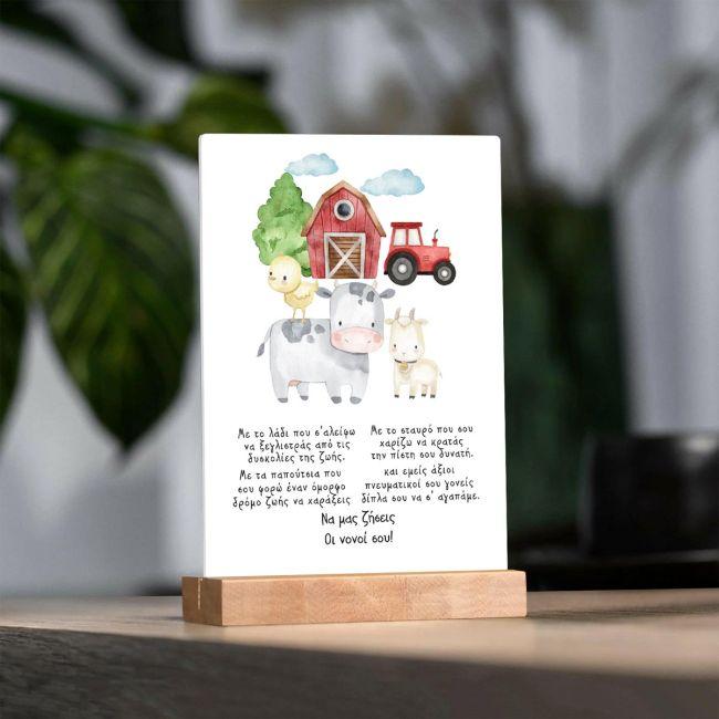 Πινακίδα stand plexiglass λευκό, με εκτύπωση ευχής, φάρμα