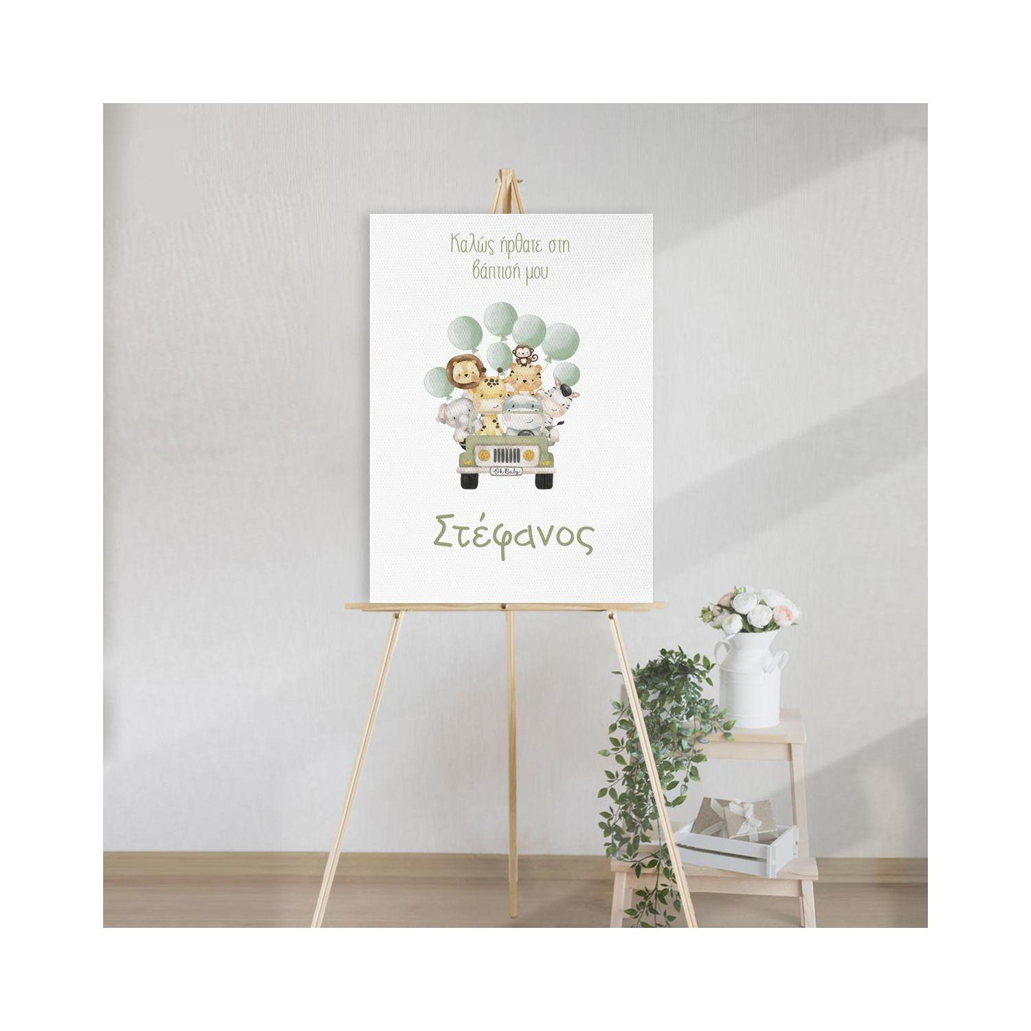 Πίνακας σε καμβά υποδοχής βάπτισης, Ζωάκια σε τζιπάκι με μπαλόνια