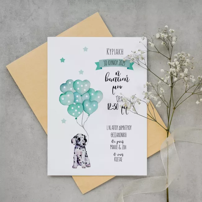 Προσκλητήριο πάρτι, βάπτισης, Σκυλάκι Δαλματίας με μπαλόνια