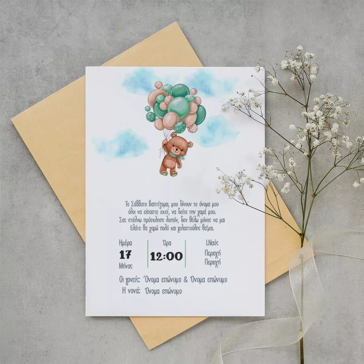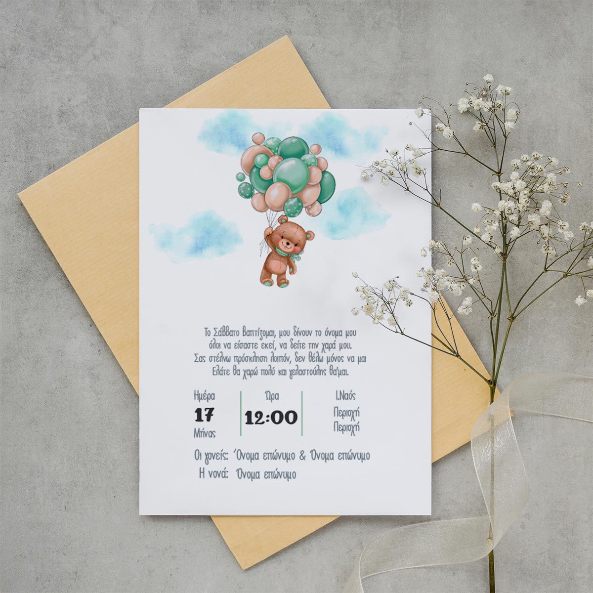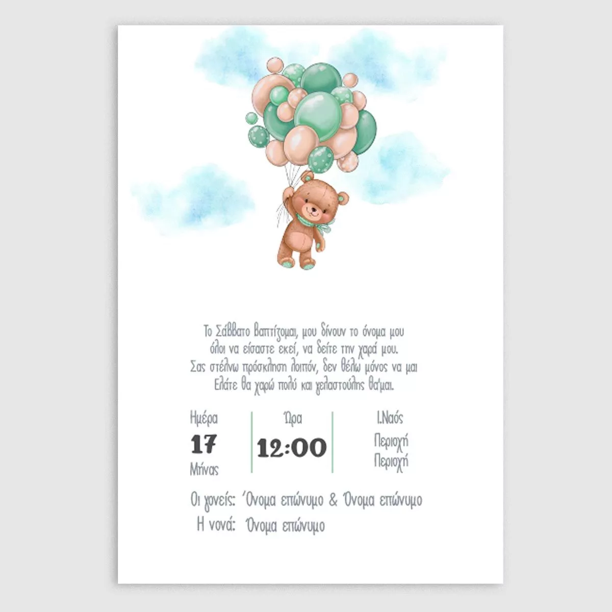Προσκλητήριο βάπτισης, Αρκουδάκι με πράσινα μπαλόνια