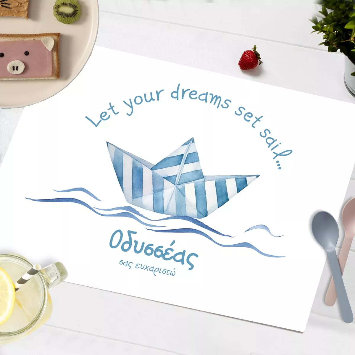 - Ναυτικό θέμα: Η τρυφερή ακουαρέλα με το ριγέ καραβάκι προσδίδει μια αίσθηση ταξιδιού και περιπέτειας.
