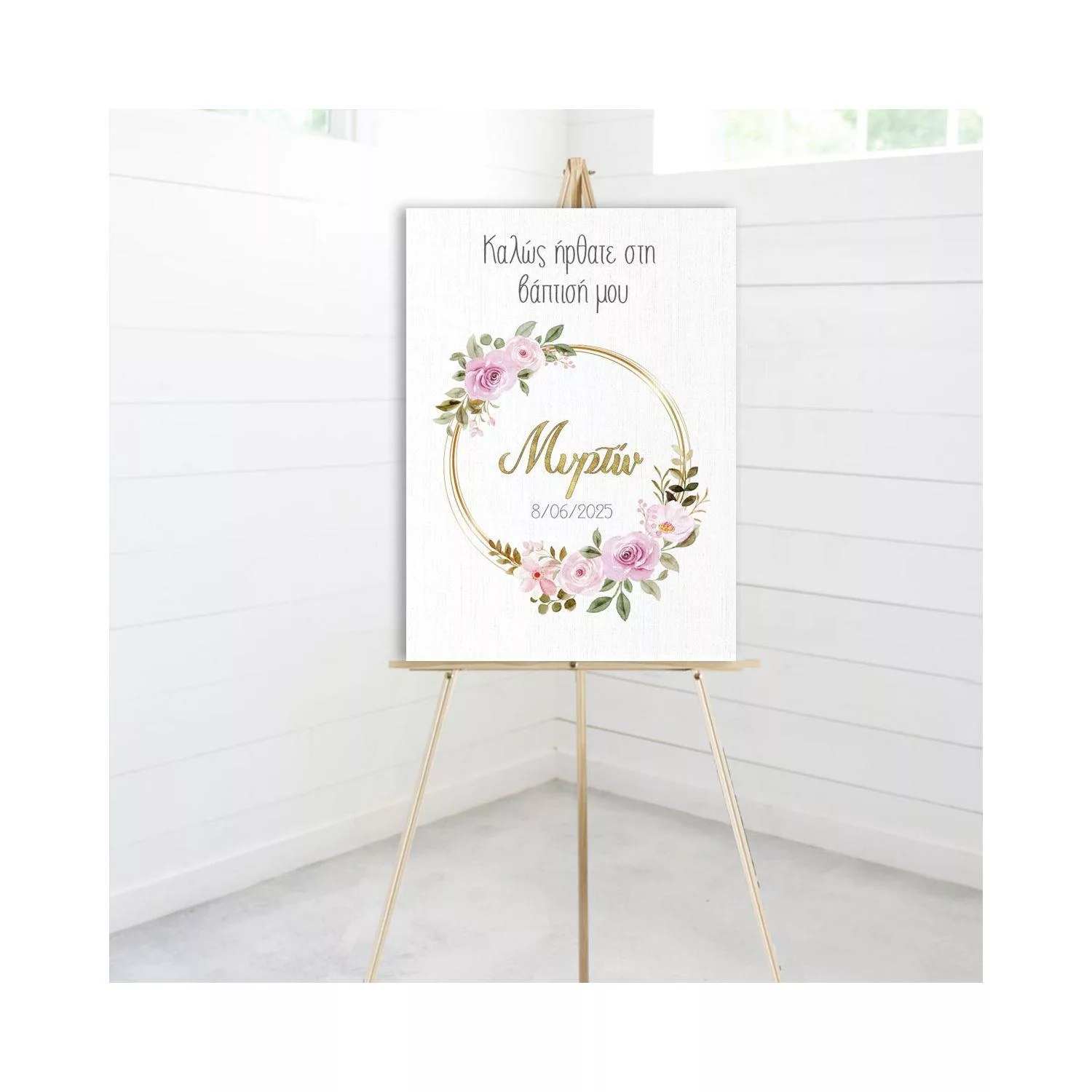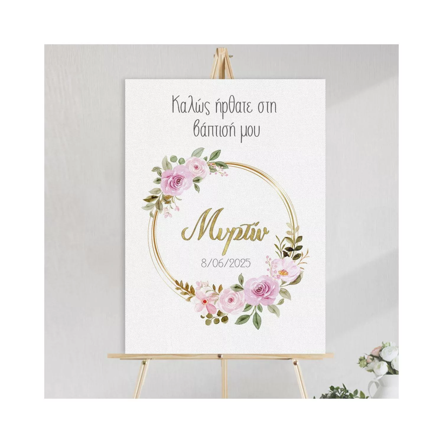 Πίνακας σε καμβά Καλώς ήρθατε στη βάπτιση μου, Λουλούδια χρυσοί κύκλοι και γράμματα