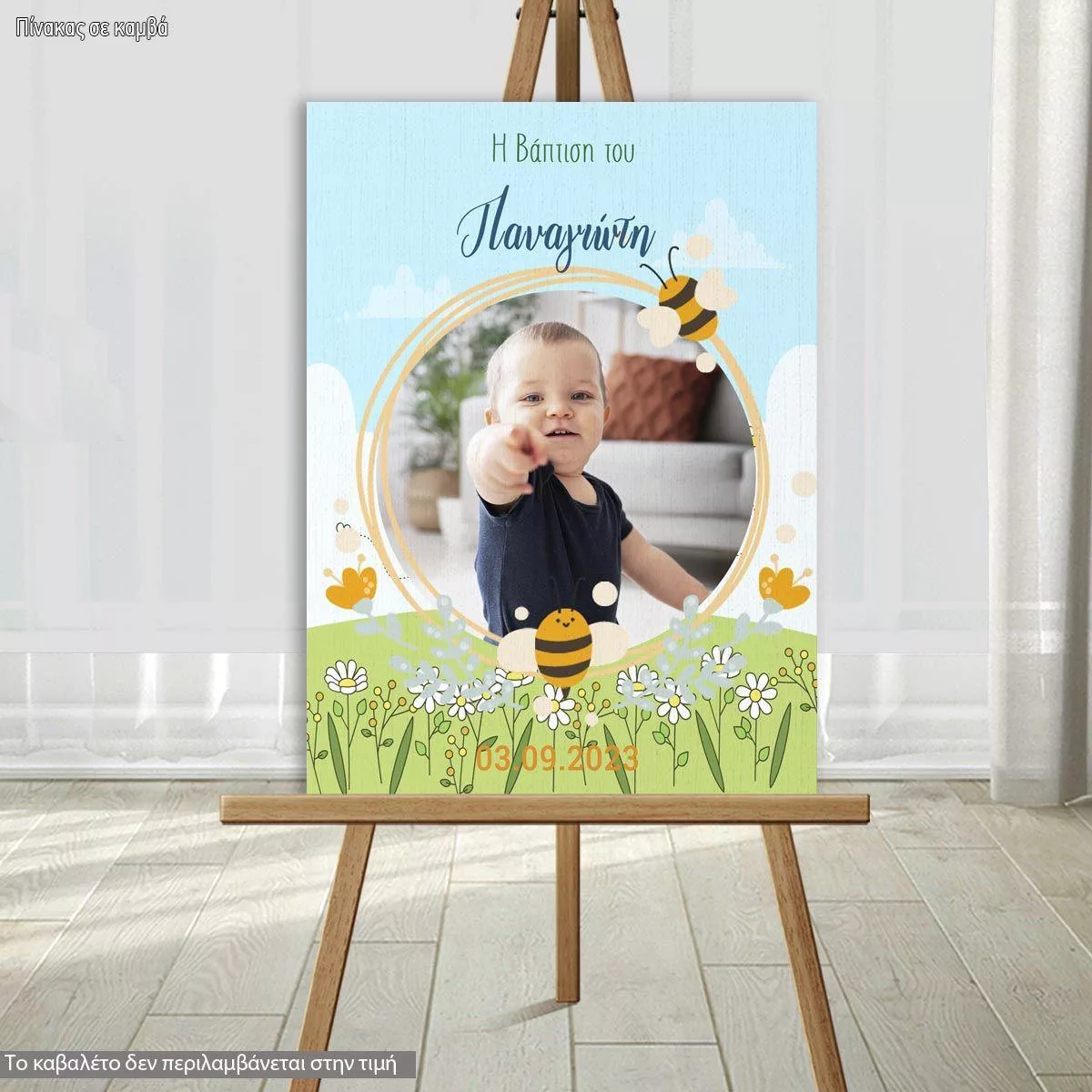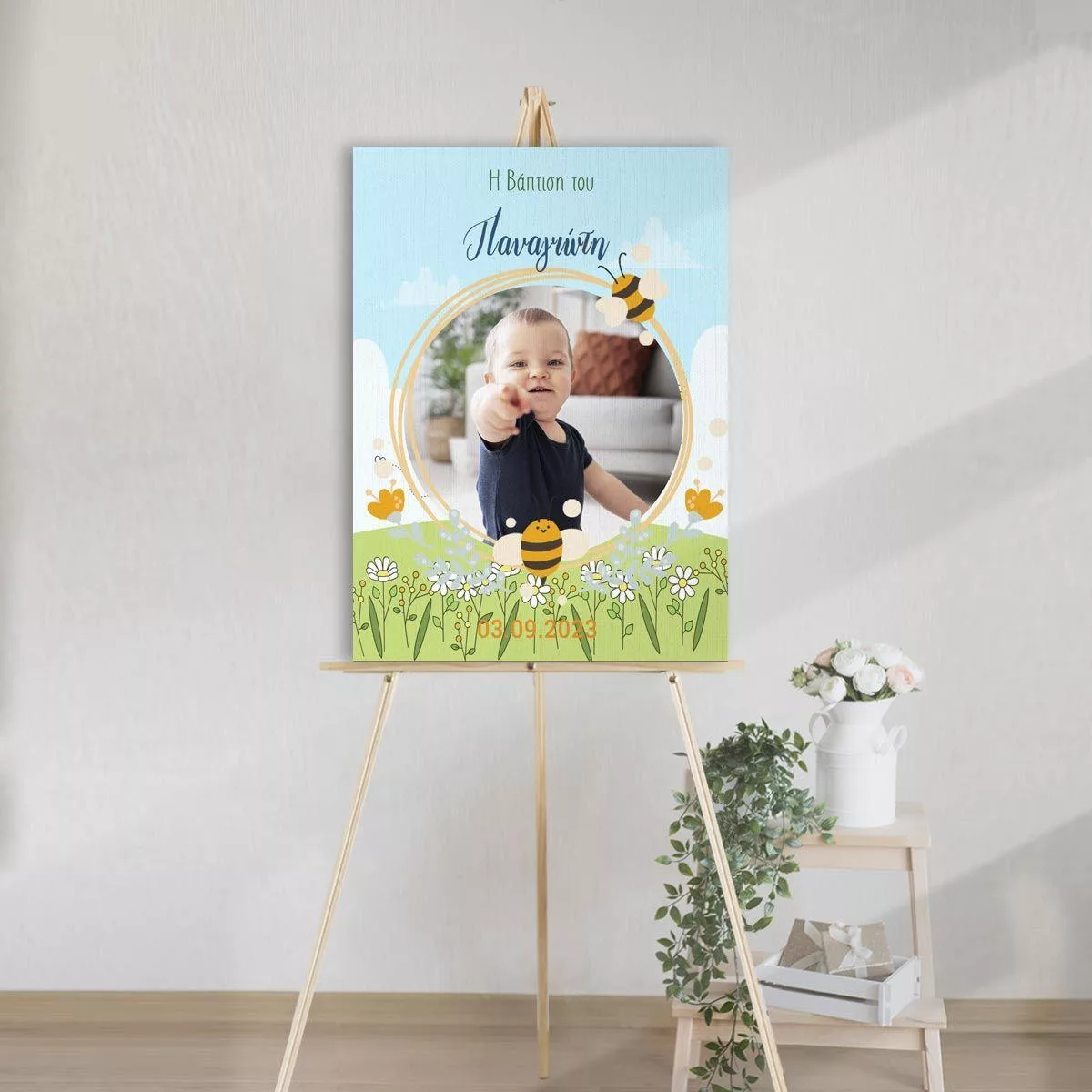 Πίνακας σε καμβά Καλώς ήρθατε στη βάπτιση μου, Μελισσάκια με φωτογραφία και λουλούδια