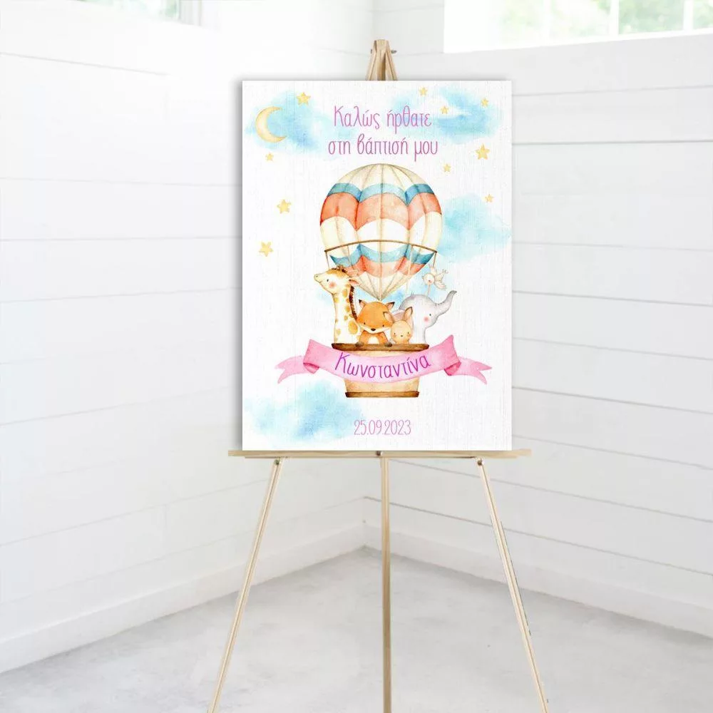 Πίνακας σε καμβά Καλώς ήρθατε στη βάπτιση μου, Αερόστατο και ζωάκια ζωγραφιστά