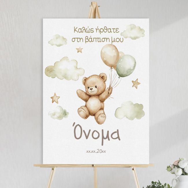 Πίνακας σε καμβά καλωσόρισμα βάπτισης, Αρκουδάκι με καφέ πράσινα μπαλόνια και αστέρια