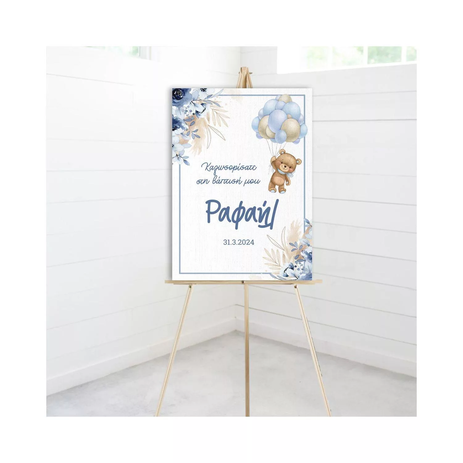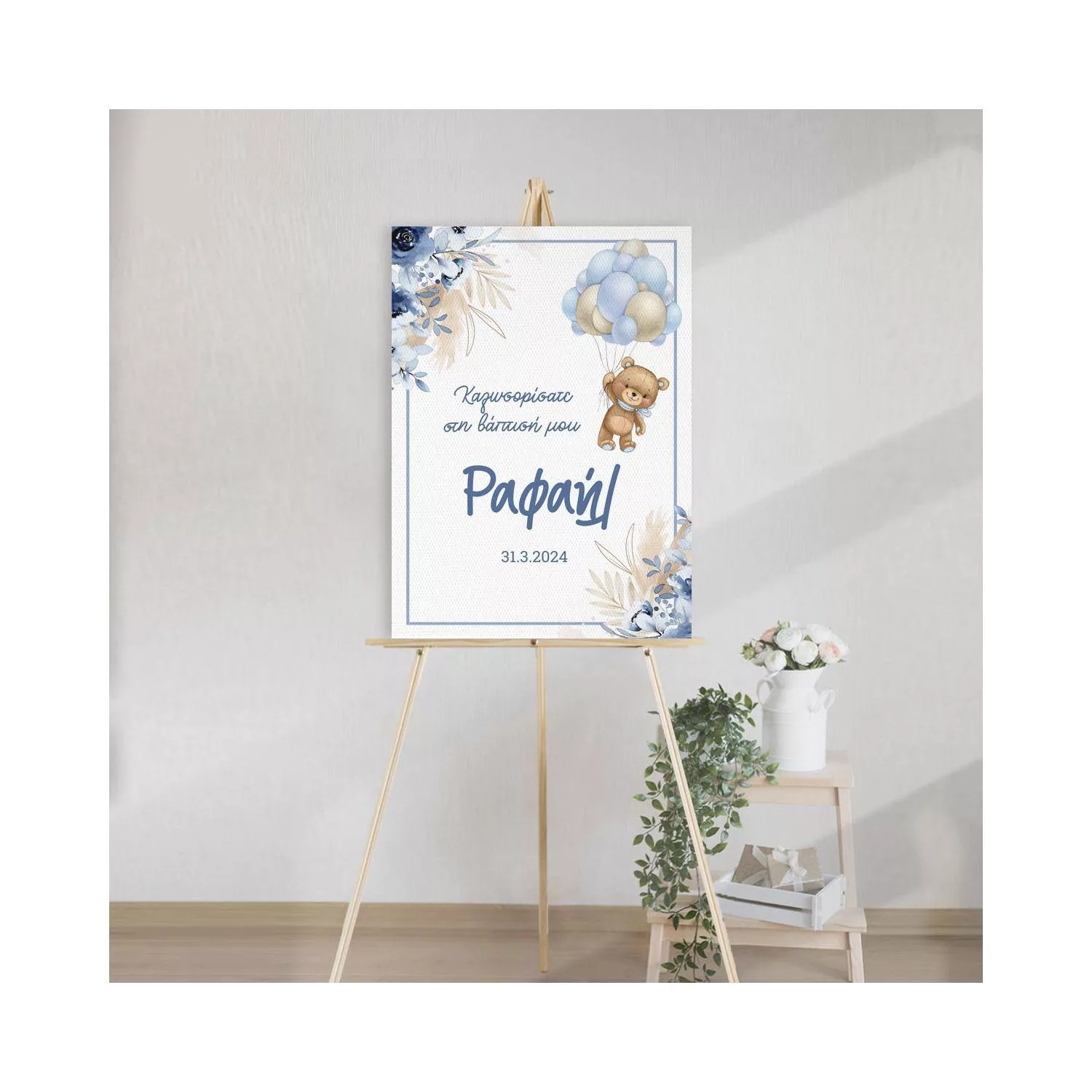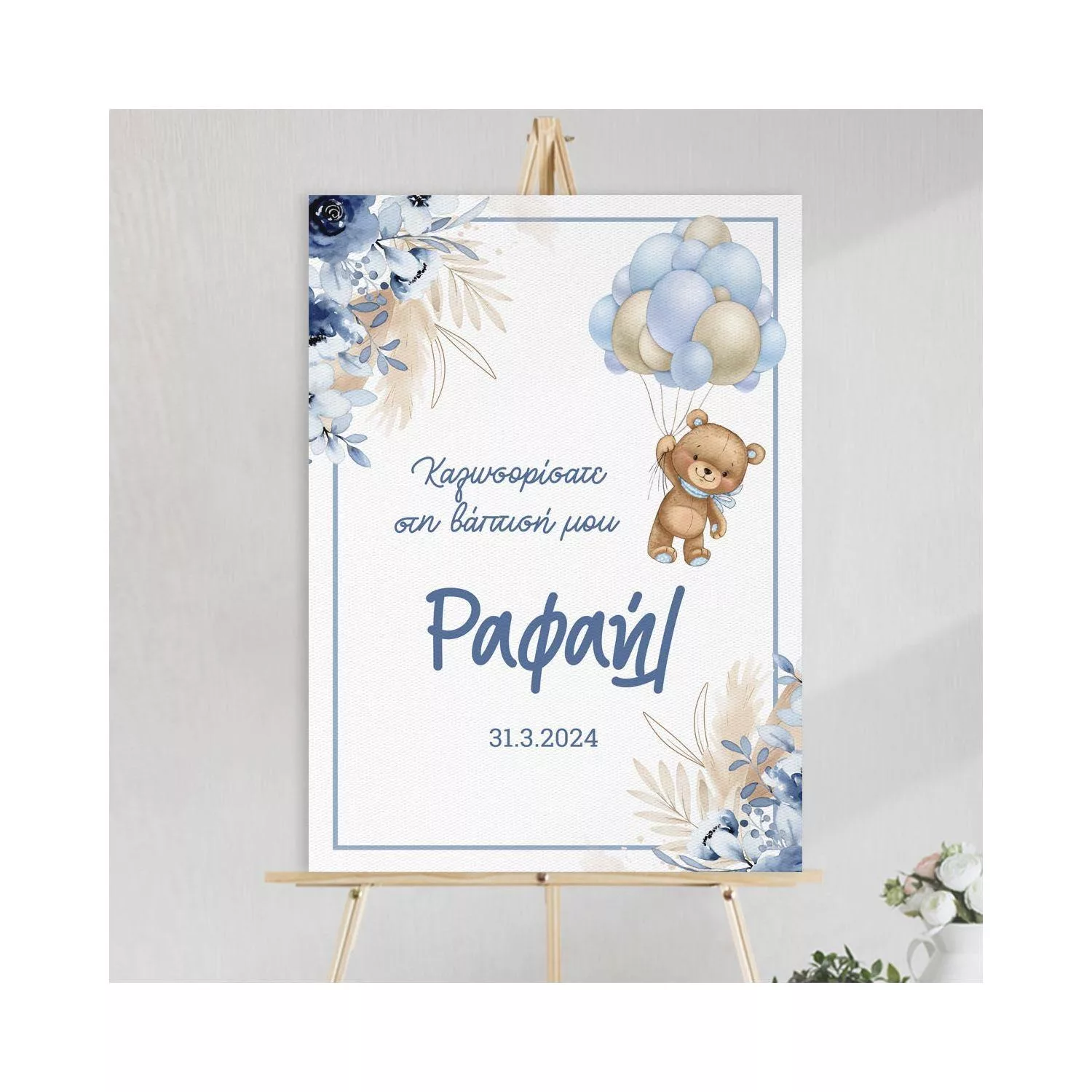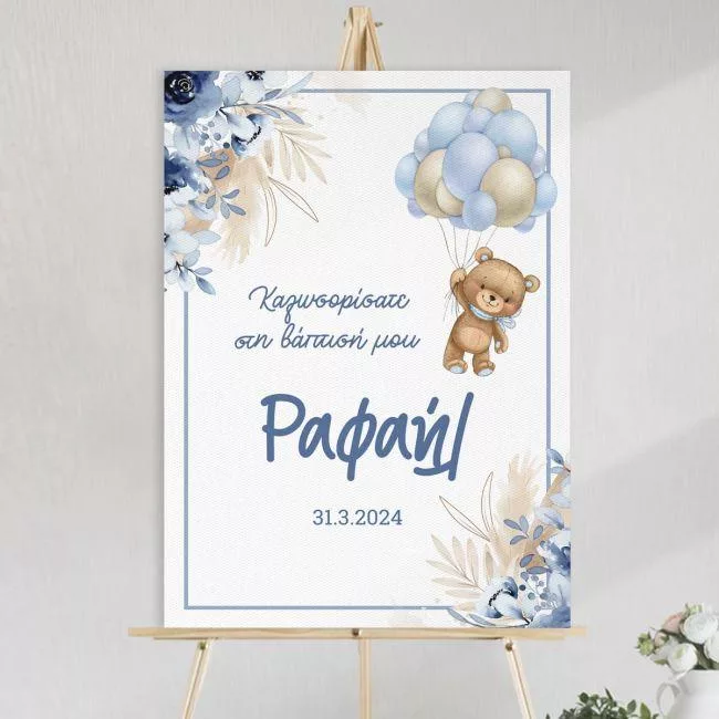 Πίνακας σε καμβά καλωσόρισμα βάπτισης, Αρκουδάκι με μπαλόνια και λουλούδια