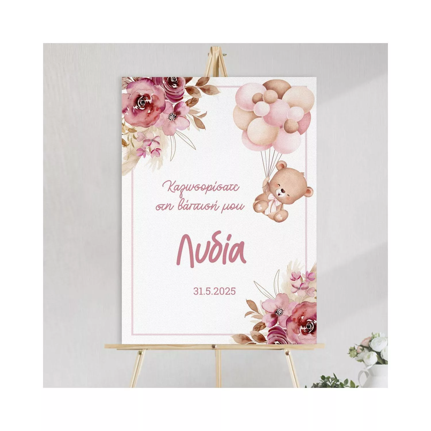 Πίνακας σε καμβά καλωσόρισμα βάπτισης, Αρκουδάκι με μπαλόνια και λουλούδια ροζ