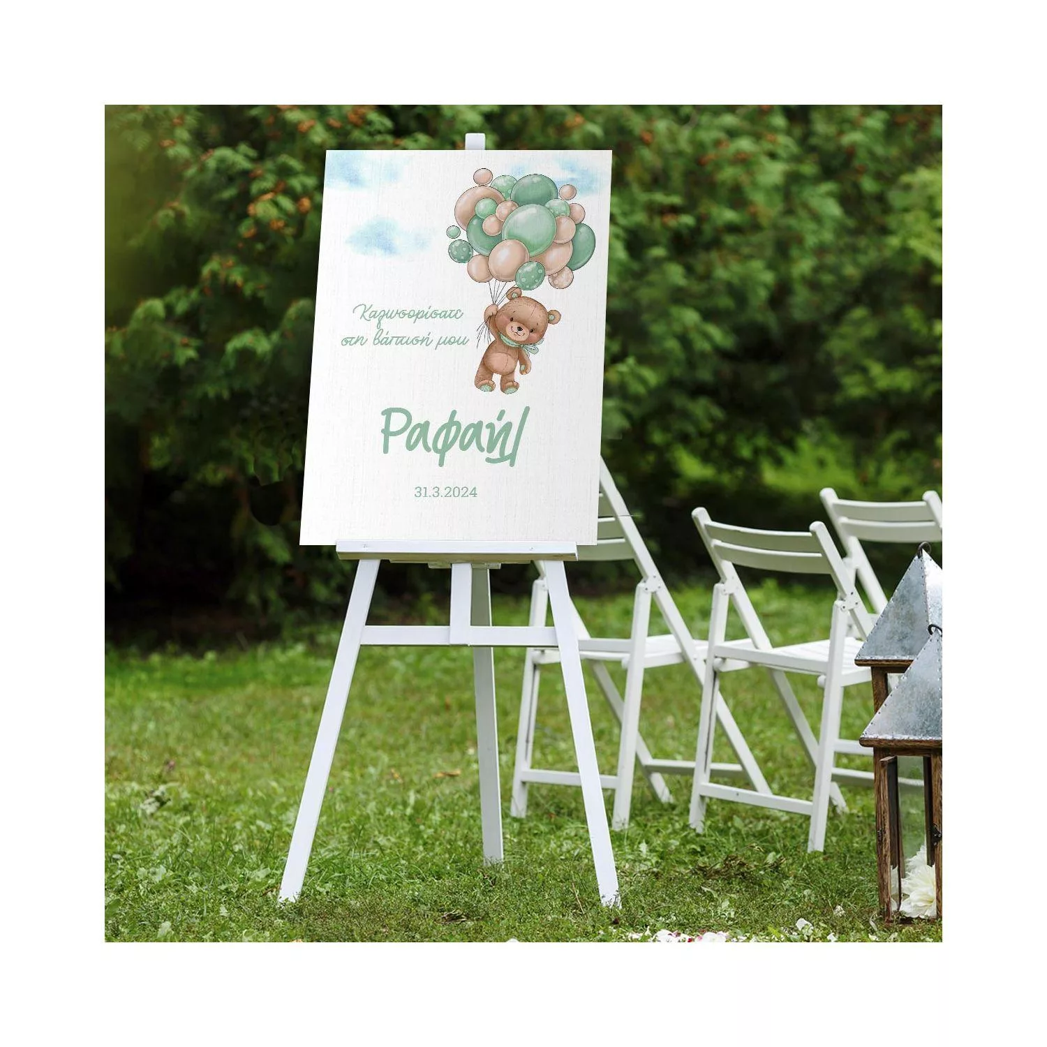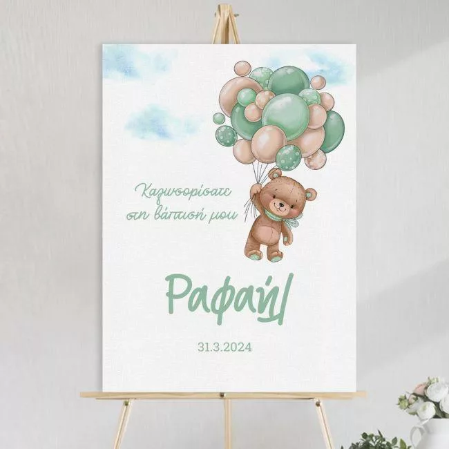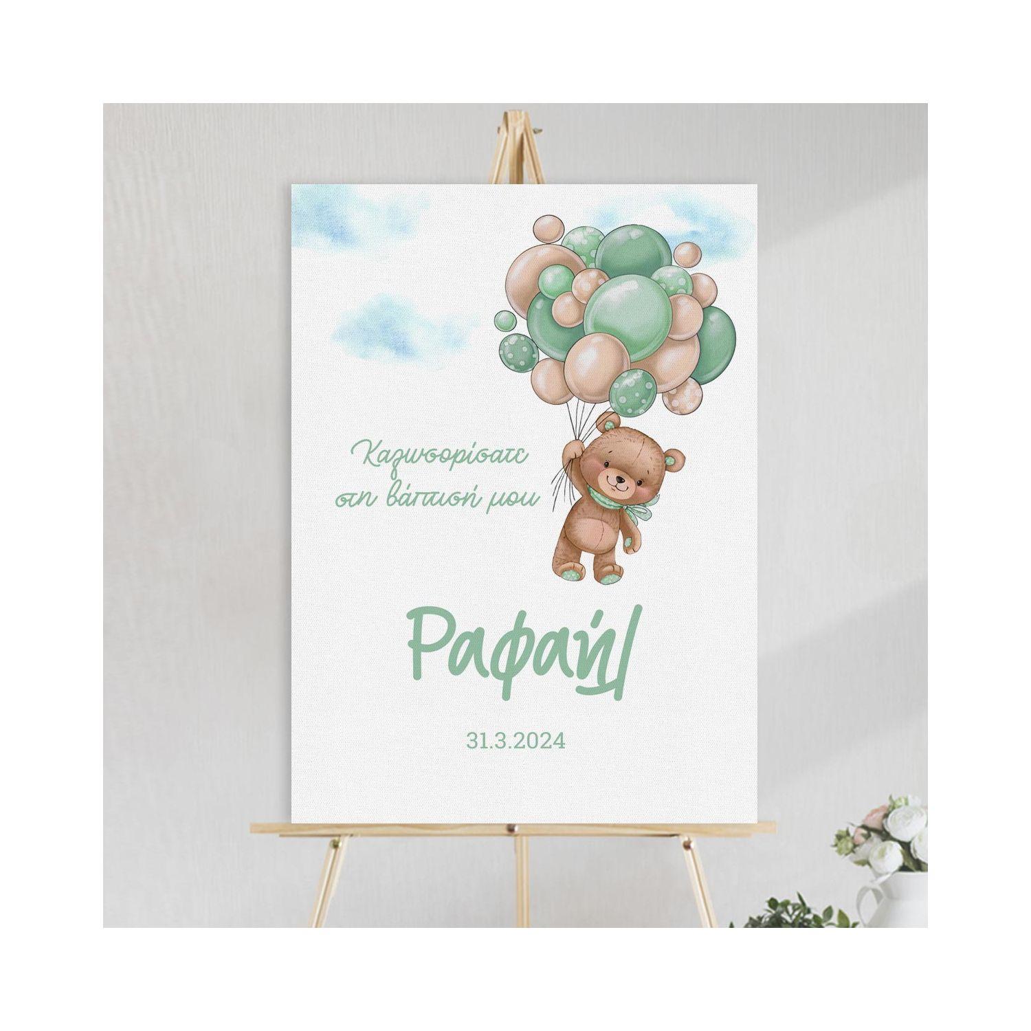 Πίνακας σε καμβά καλωσόρισμα βάπτισης, Αρκουδάκι με πράσινα μπαλόνια