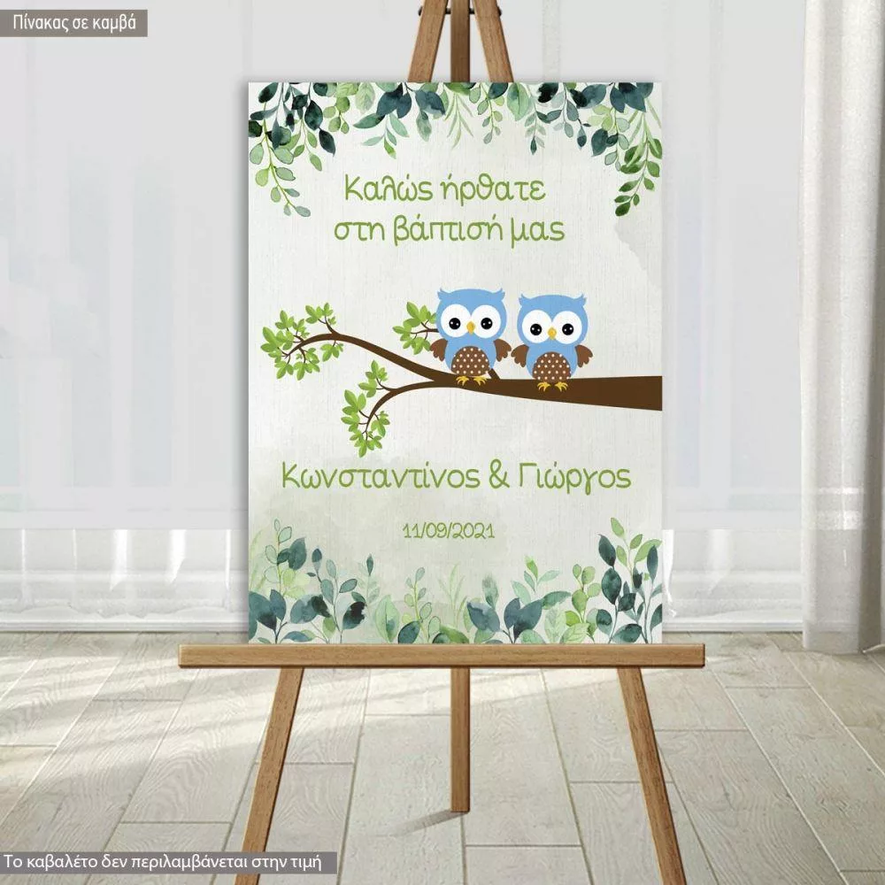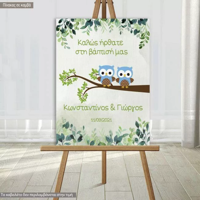 Πίνακας σε καμβά Καλώς ήρθατε στη βάπτιση μας, δίδυμα κουκουβάγιες