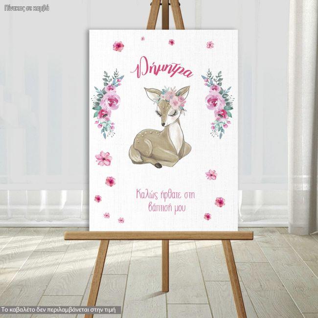 Πίνακας σε καμβά καλωσόρισμα βάπτισης, Ελαφάκι καθιστό με ζωγραφιστά λουλούδια