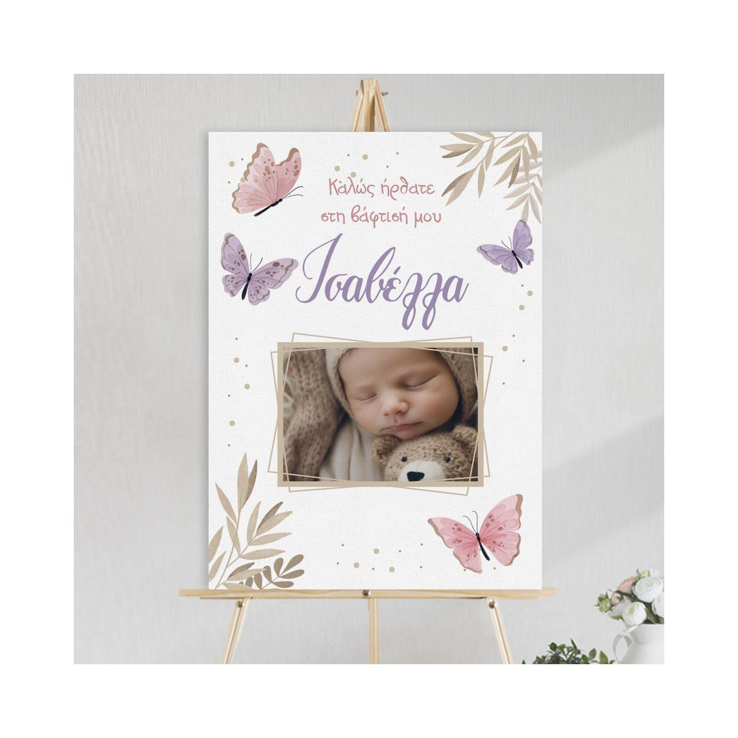 Πίνακας σε καμβά καλωσόρισμα βάπτισης, Πεταλούδες floral με φωτογραφία