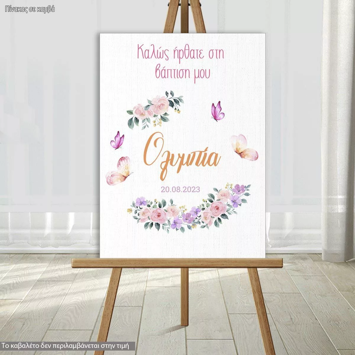 Πίνακας σε καμβά καλωσόρισμα βάπτισης, Πεταλούδες και λουλούδια