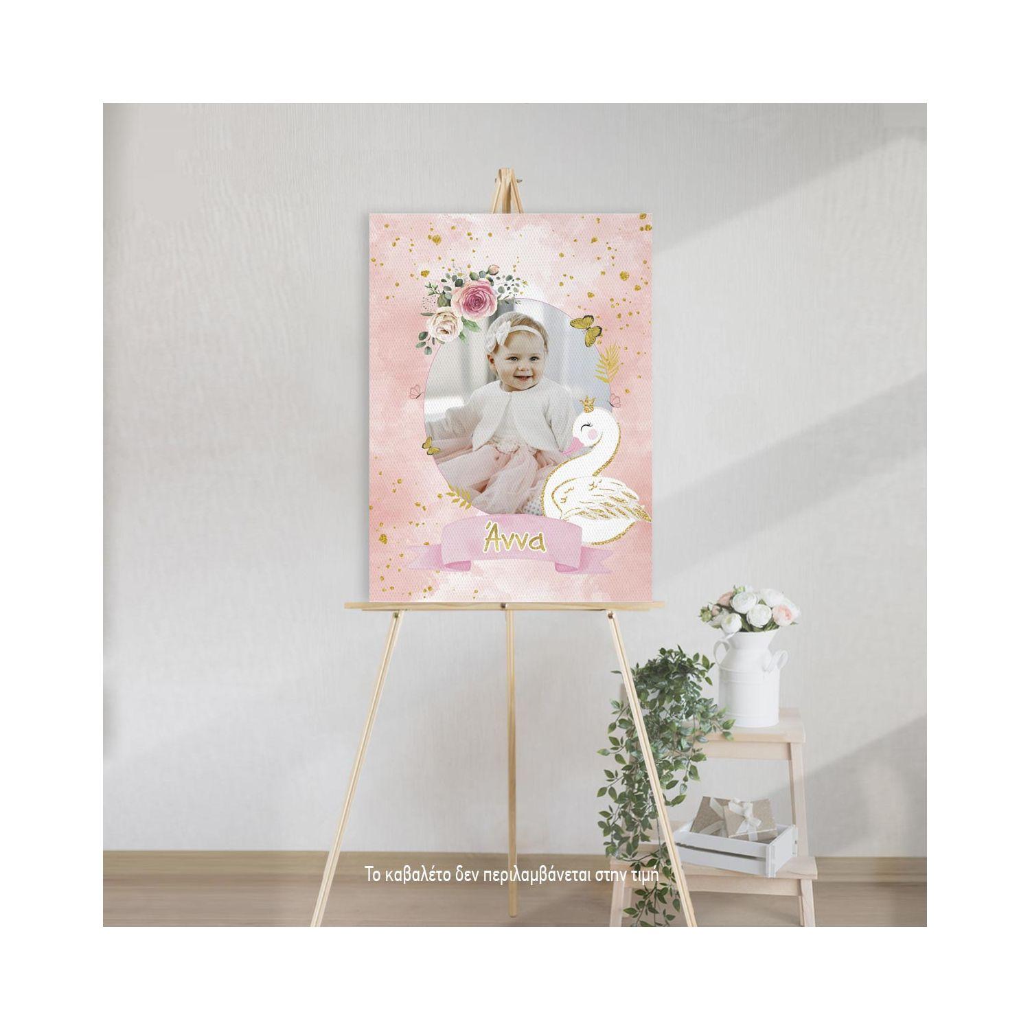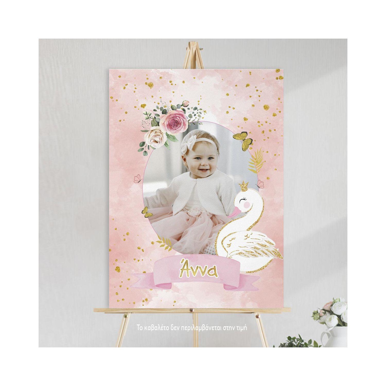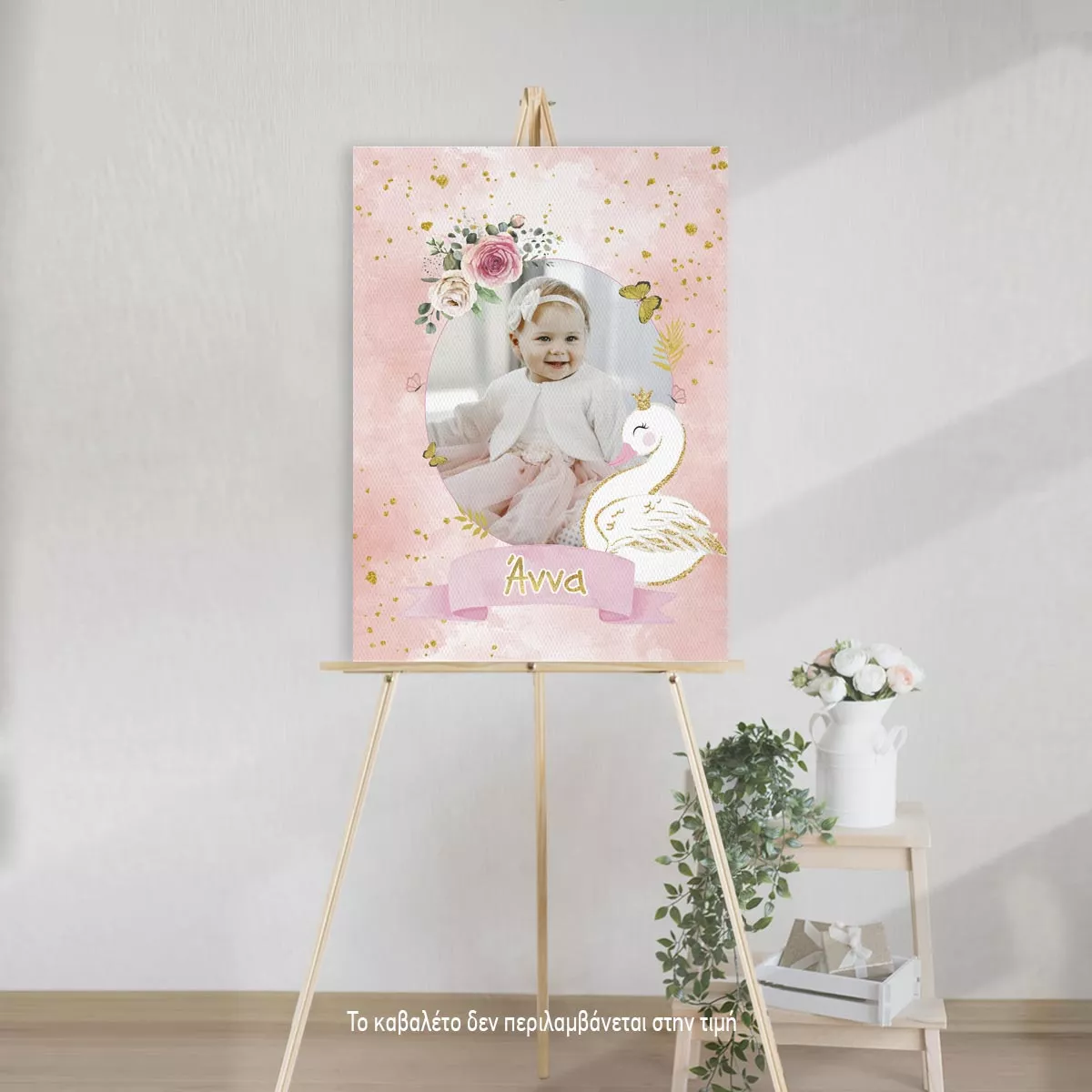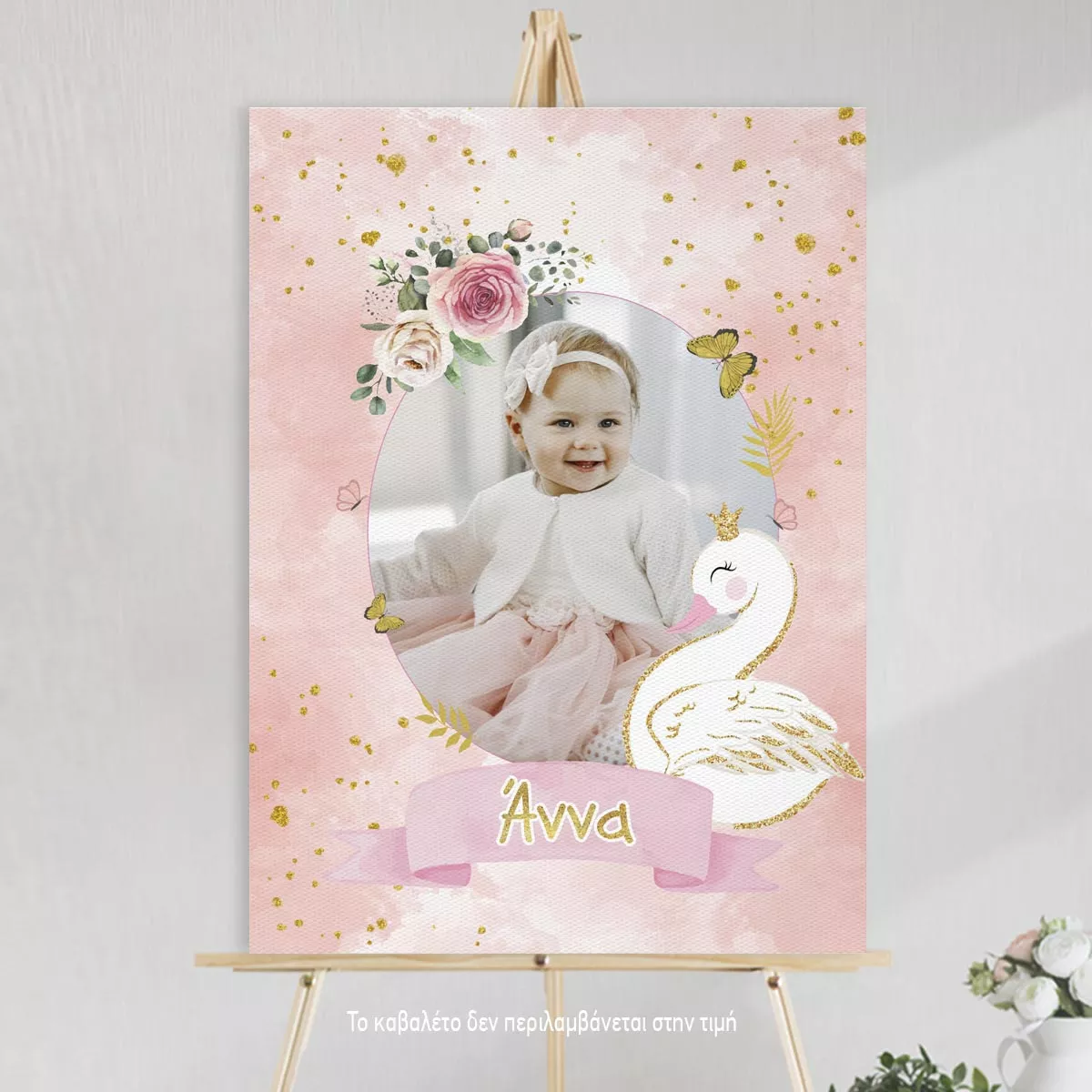 Πίνακας σε καμβά βάπτισης, Κύκνος λουλούδια ροζ με χρυσές λεπτομέρειες, με φωτογραφία