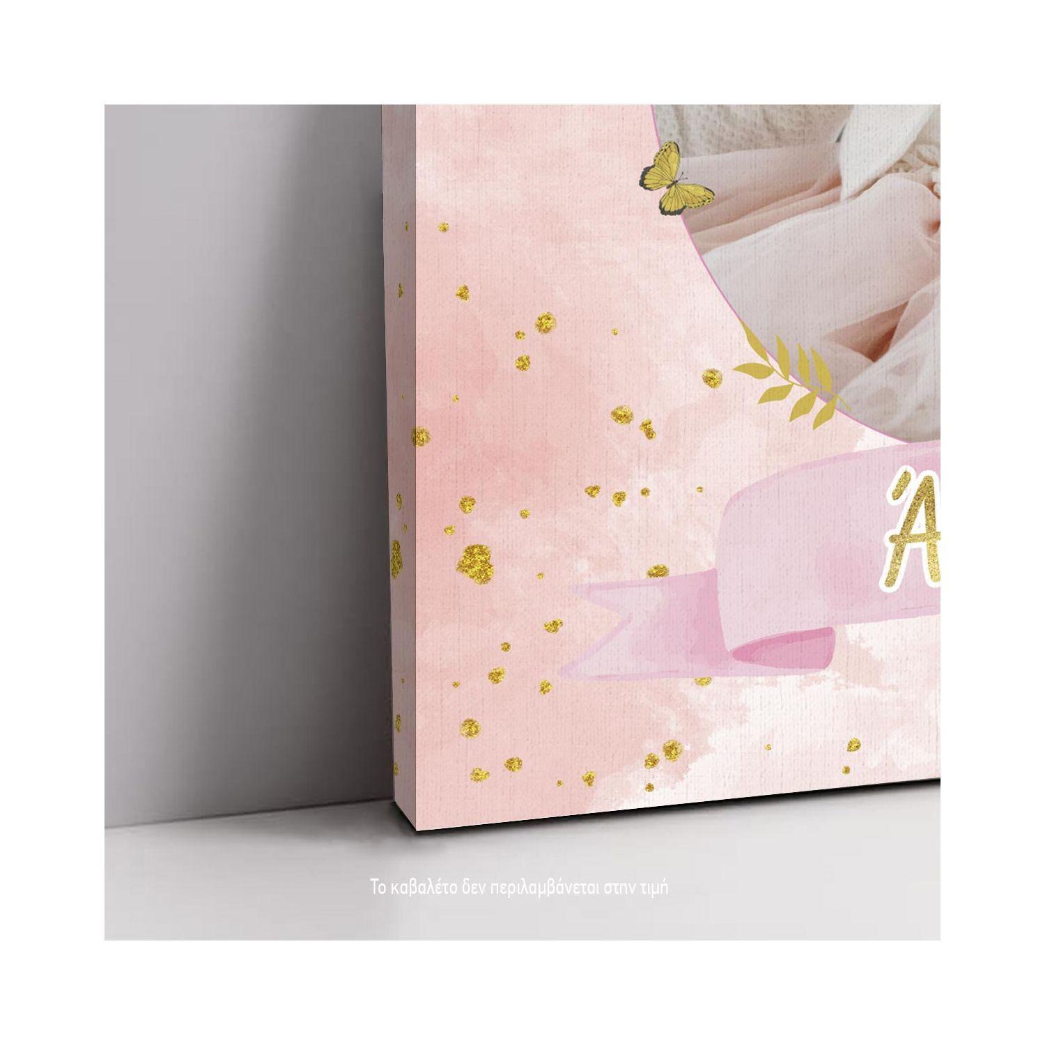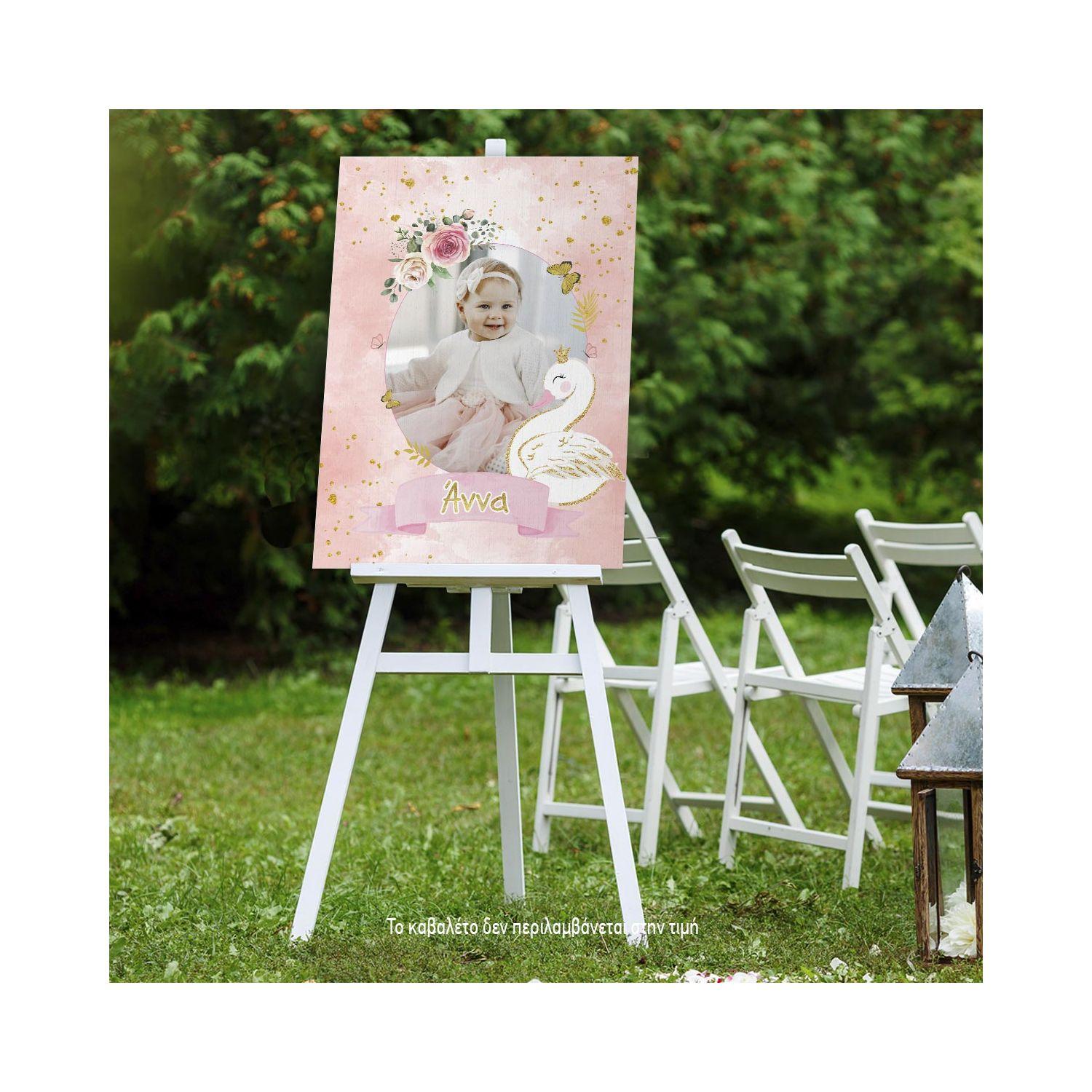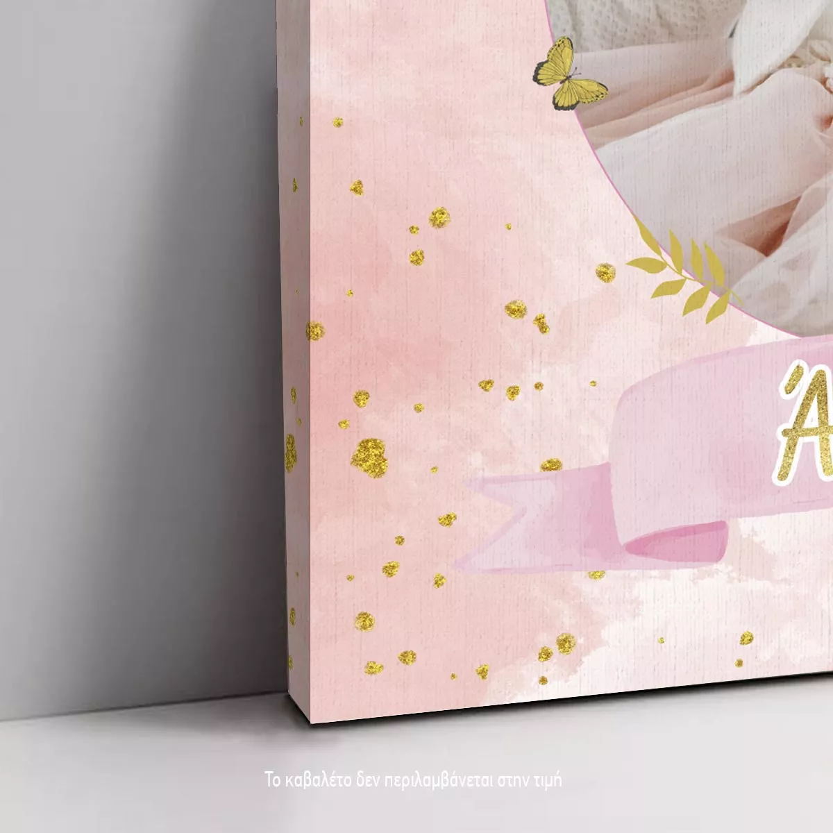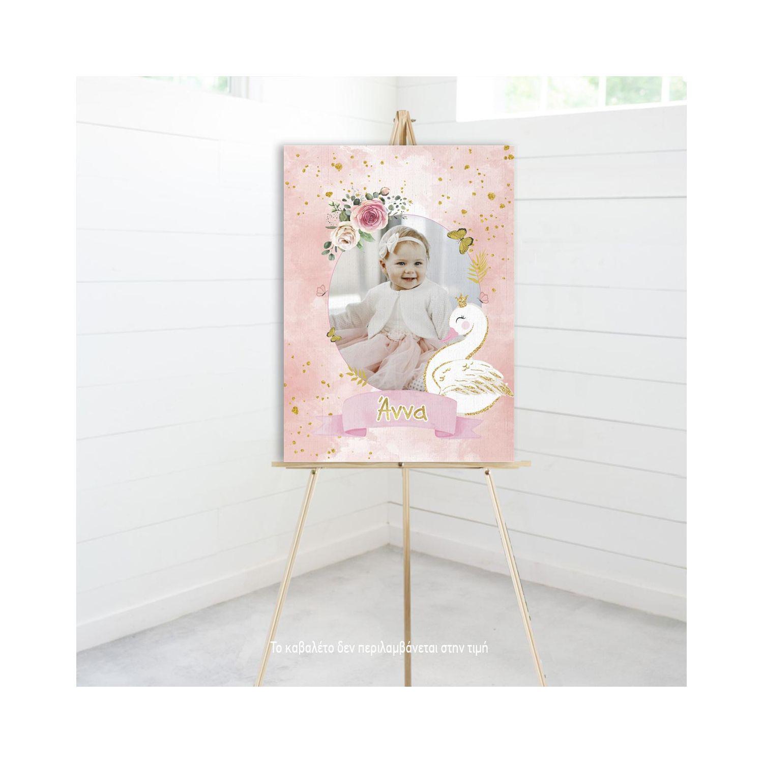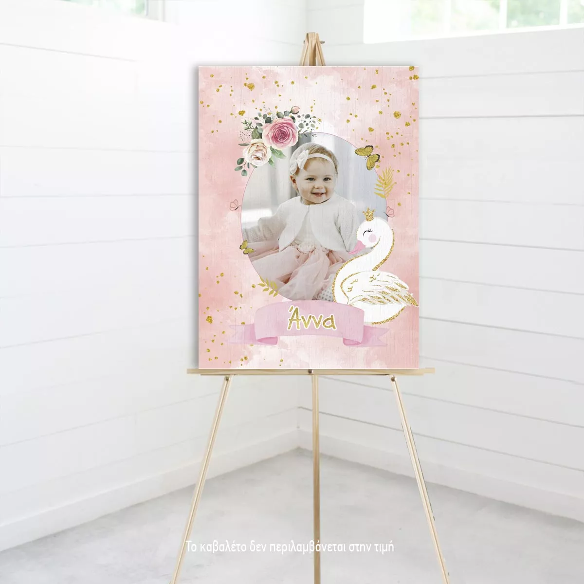 Πίνακας σε καμβά βάπτισης, Κύκνος λουλούδια ροζ με χρυσές λεπτομέρειες, με φωτογραφία