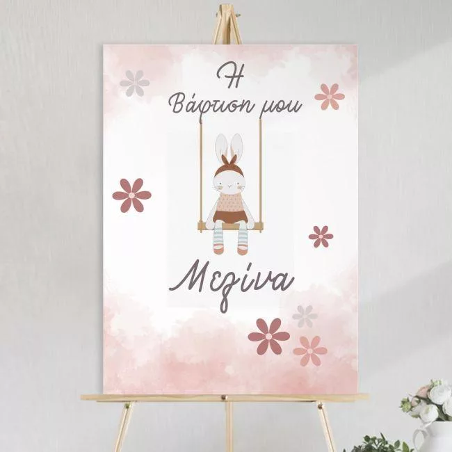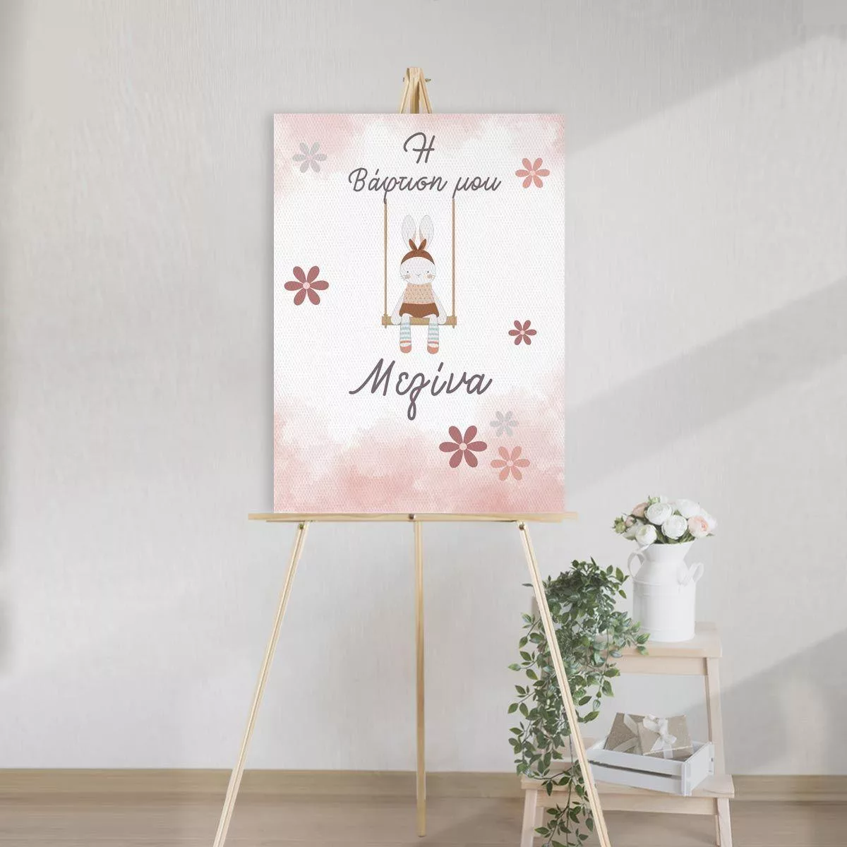 Πίνακας σε καμβά, στολισμός βάπτισης, κουνελάκι σε κούνια, και προσωποποίηση με όνομα.