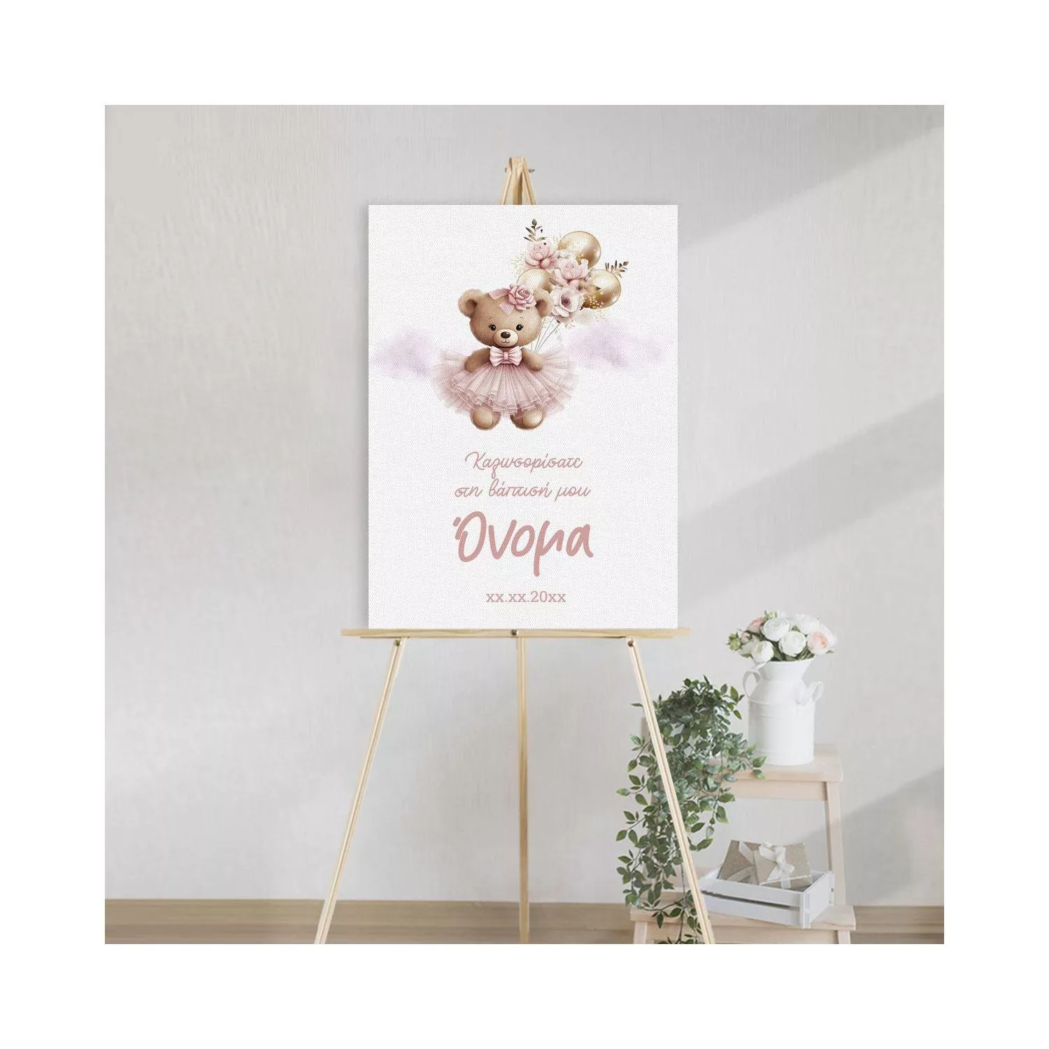 Πίνακας σε καμβά υποδοχής βάπτισης, Χαριτωμένο αρκουδάκι χρυσαφιά μπαλόνια 2