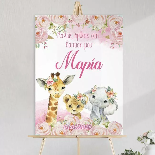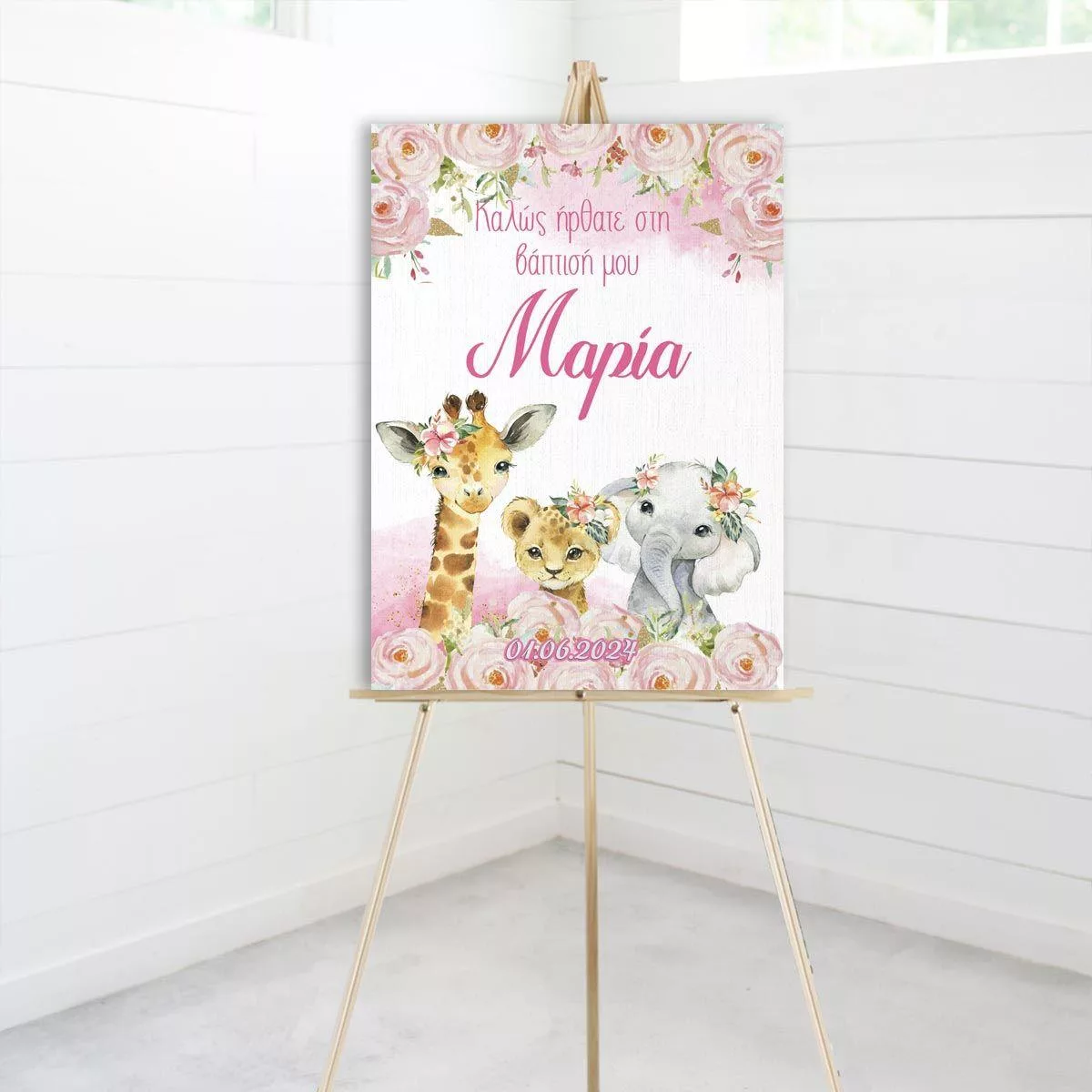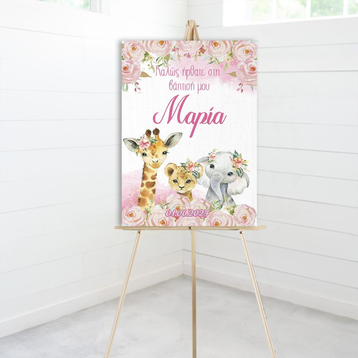 Πίνακας σε καμβά βάπτισης, Ζωάκια Αφρικής, ροζ θέμα