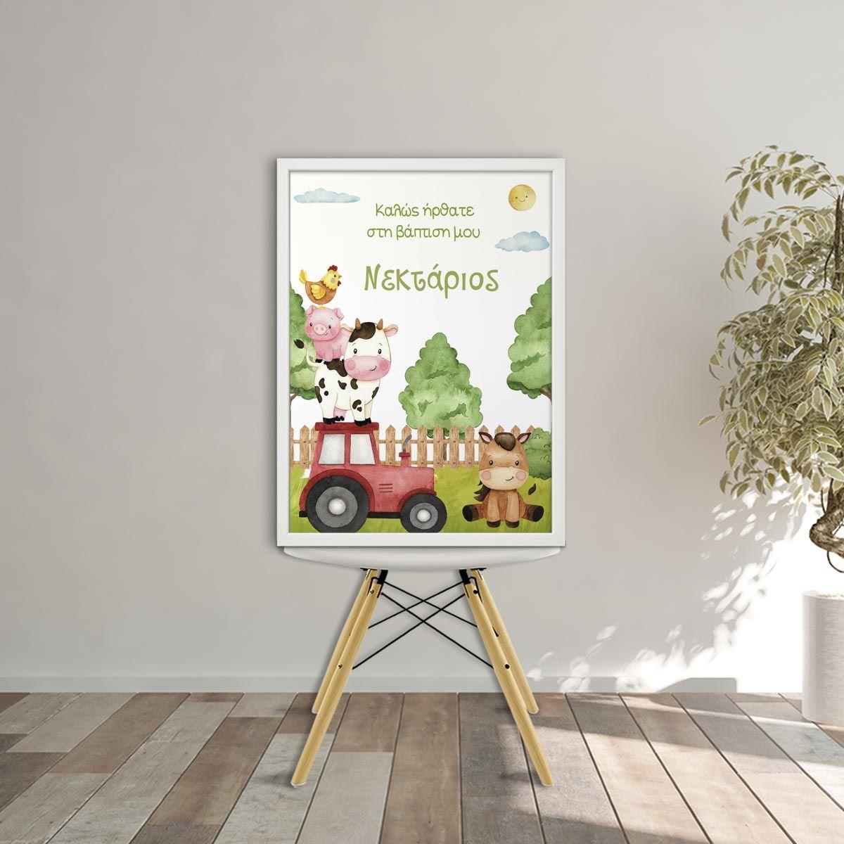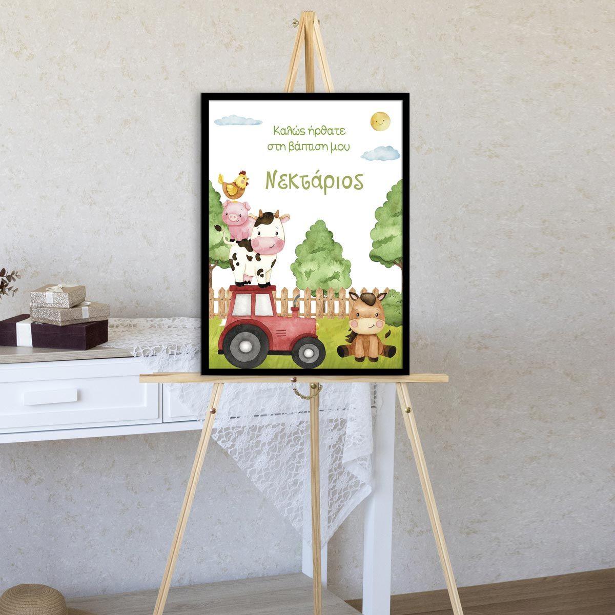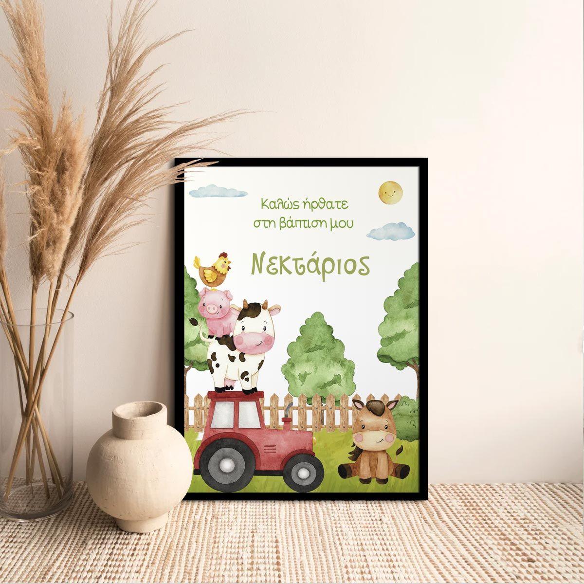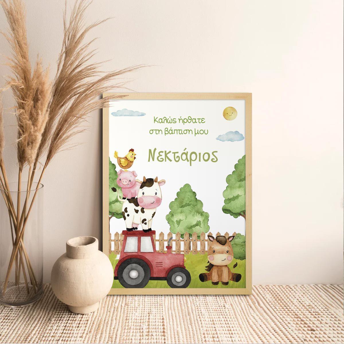 Πίνακας σε καμβά, αφίσα, πόστερ με ζωάκια φάρμας, τρακτέρ και προσωποποίηση με όνομα. Δημιουργήστε μοναδική ατμόσφαιρα στη βάπτιση με θέμα "Η Φάρμα μου".