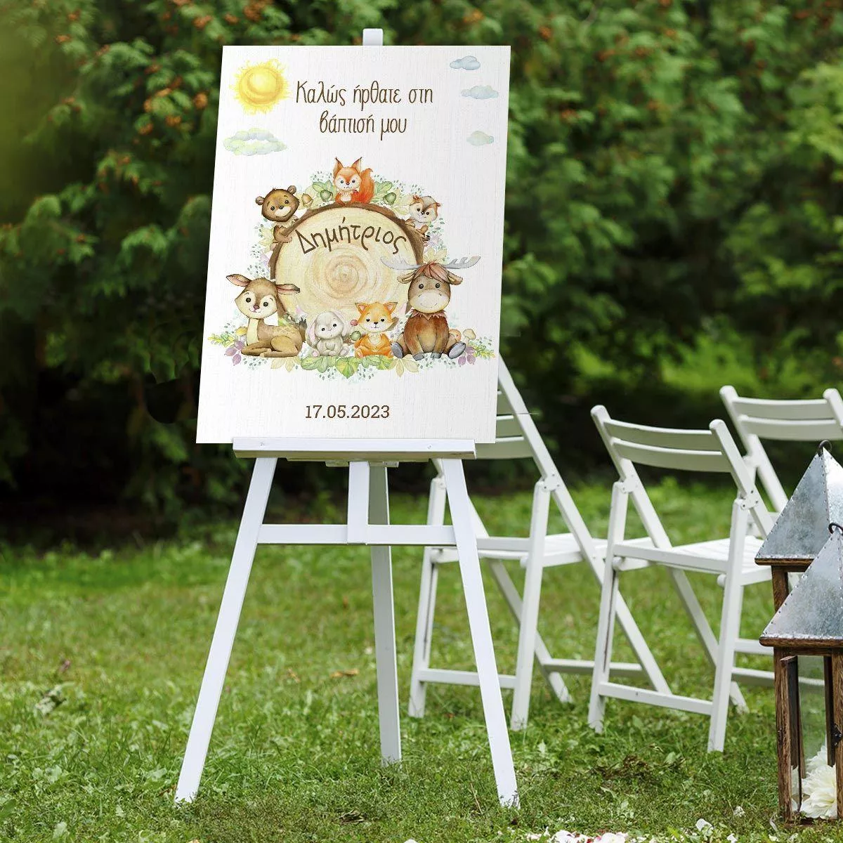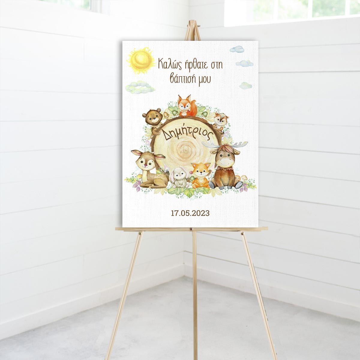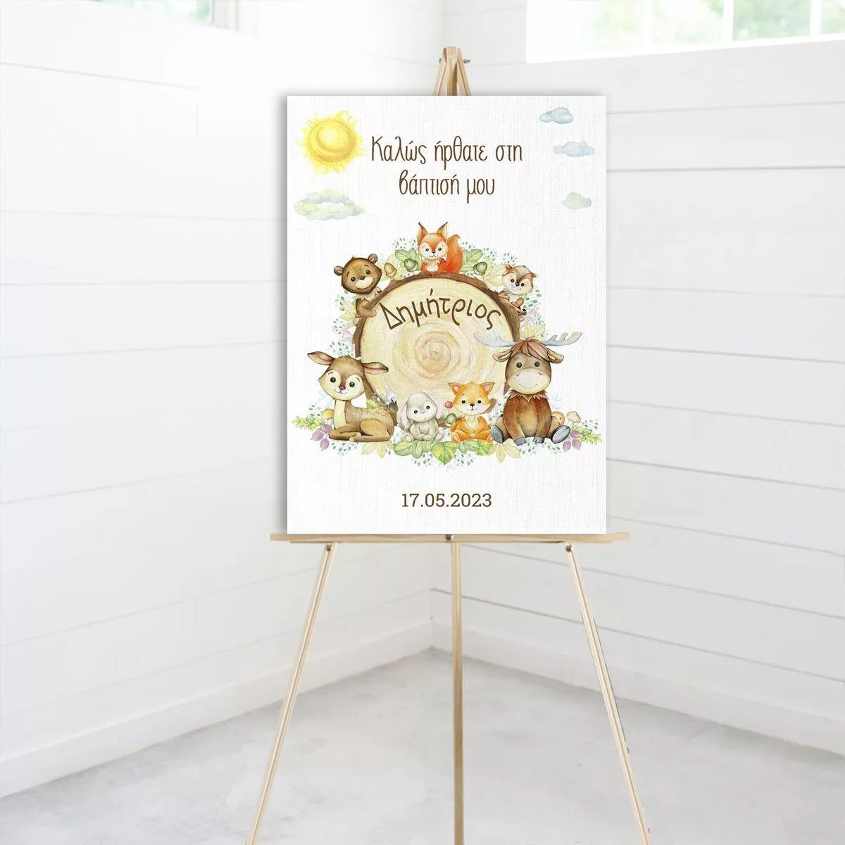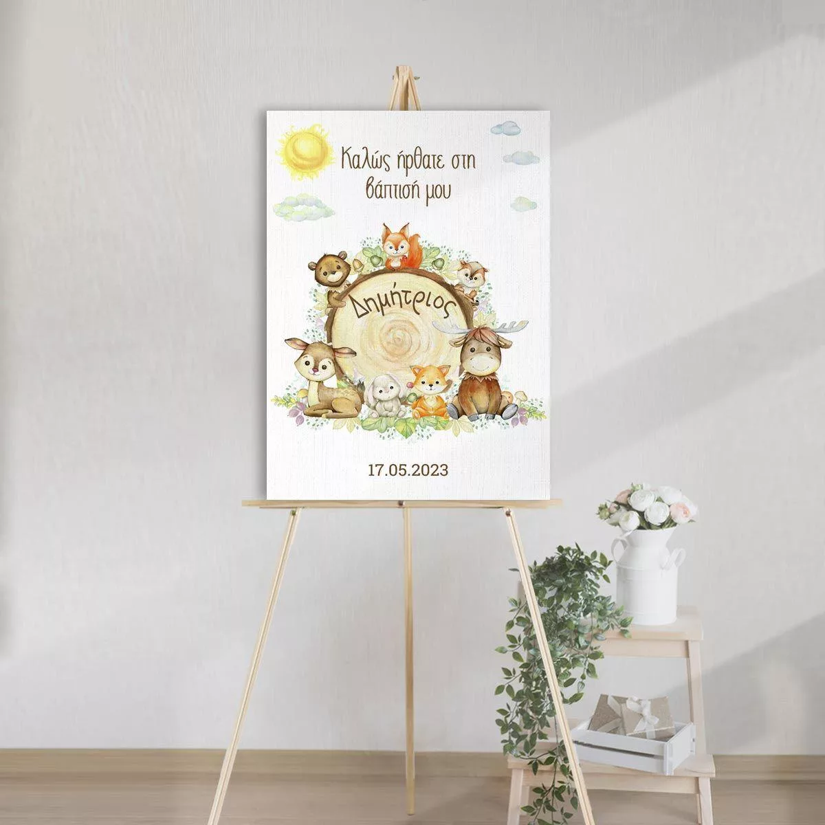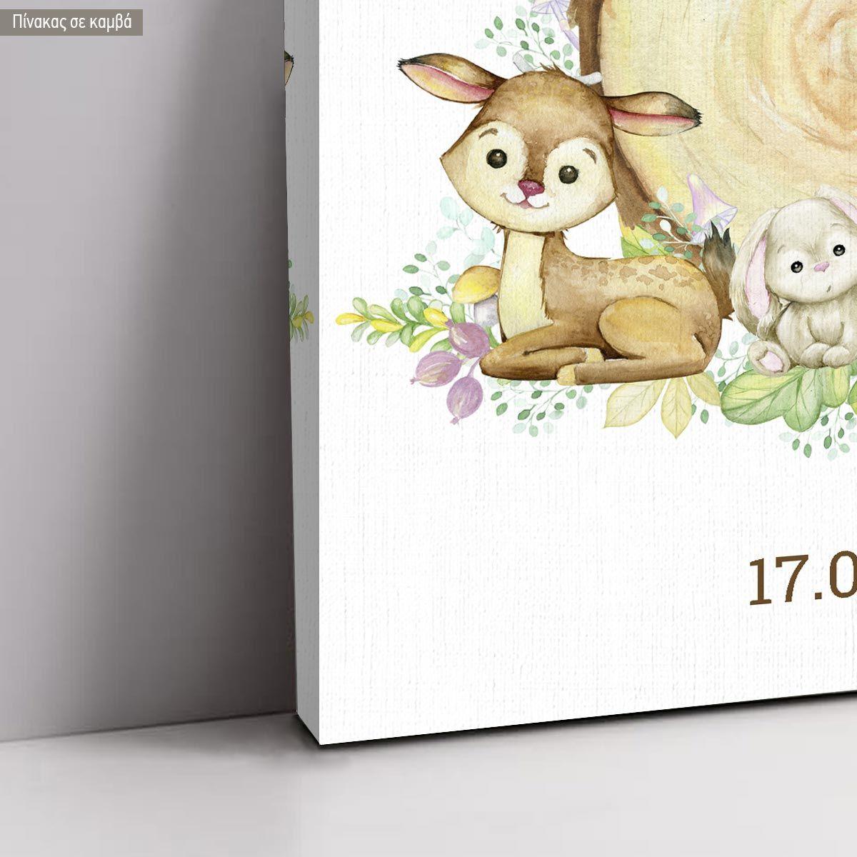Πίνακας σε καμβά υποδοχής βάπτισης, Ζωάκια του δάσους σε κορμό, ζωγραφιστά
