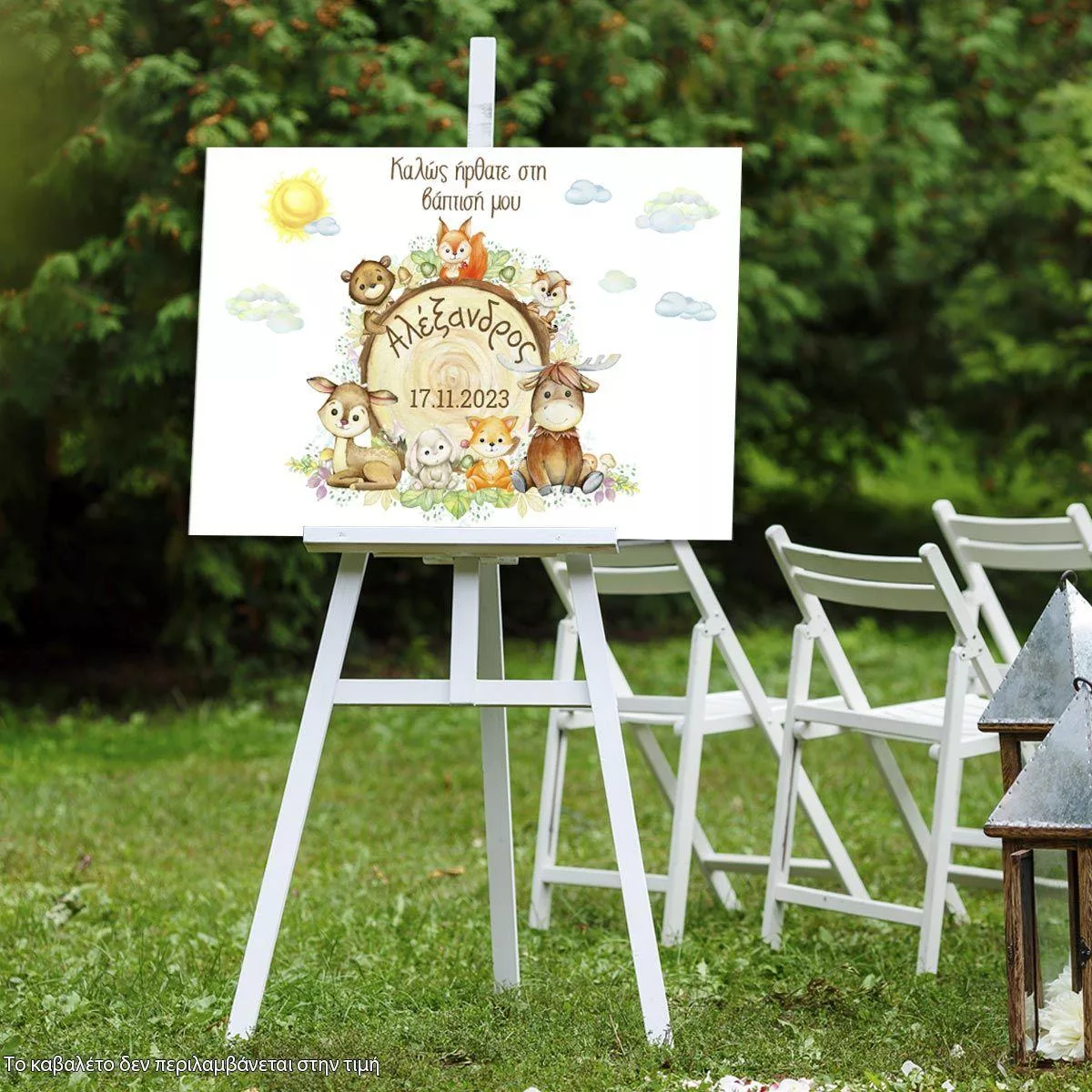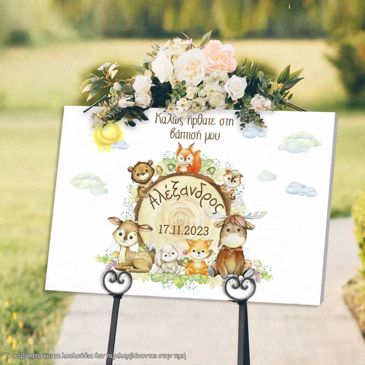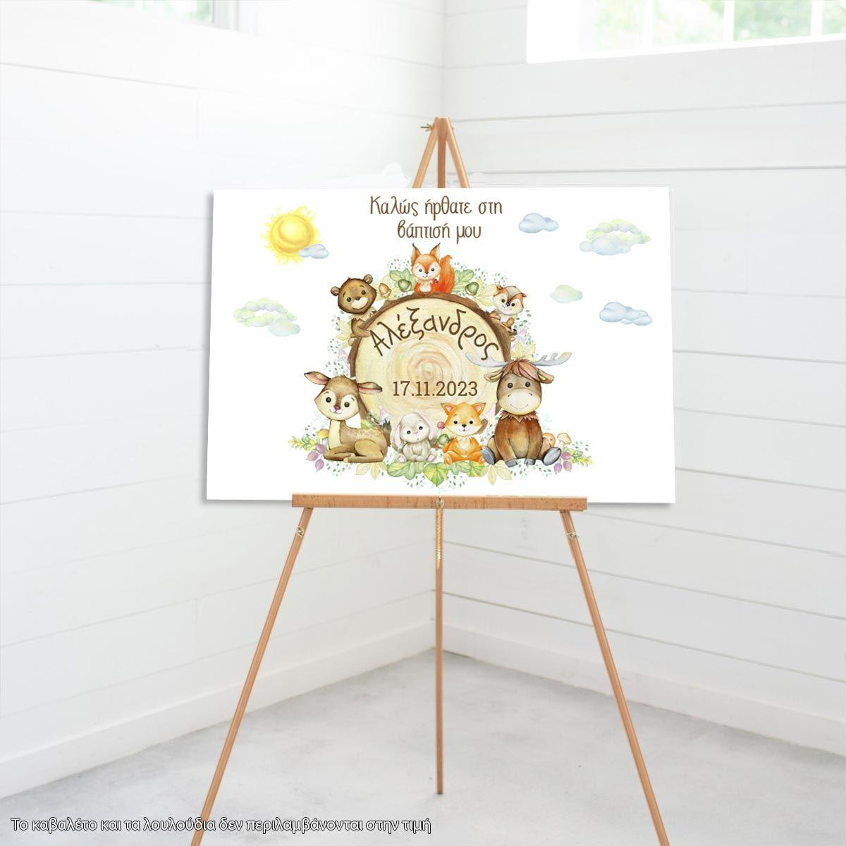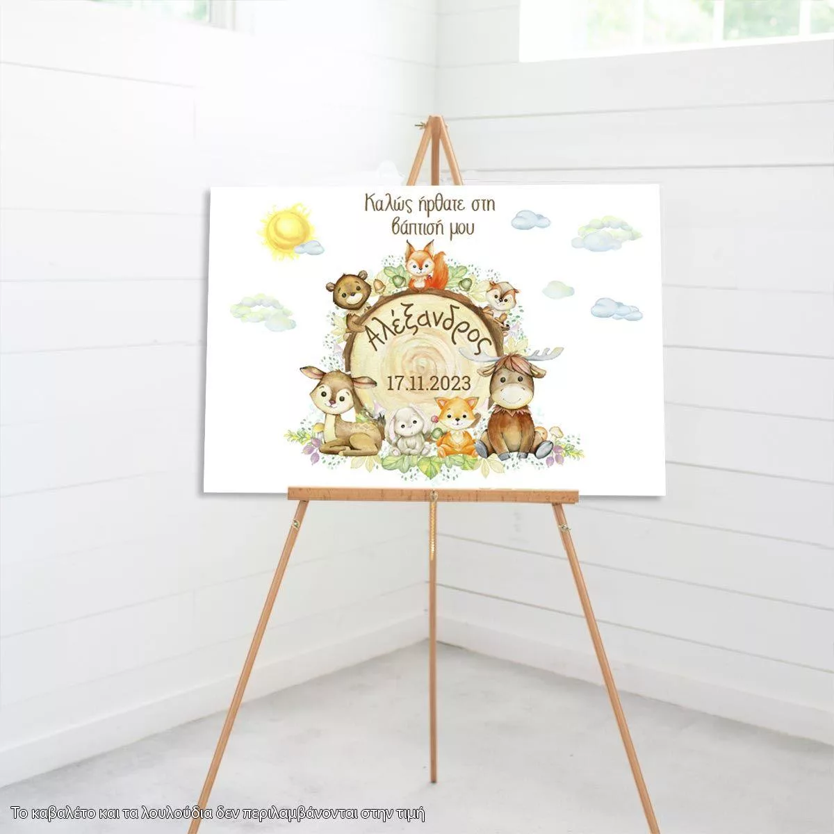 Πίνακας σε καμβά υποδοχής βάπτισης, Ζωάκια του δάσους σε κορμό, ζωγραφιστά ▭