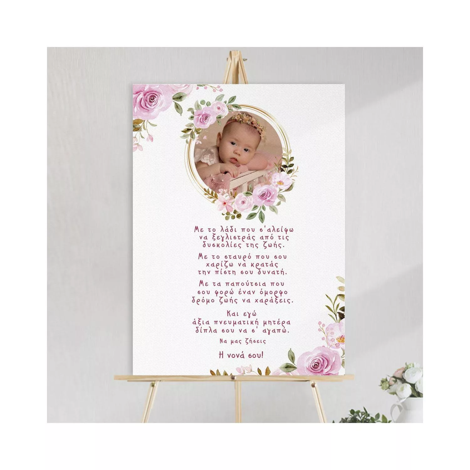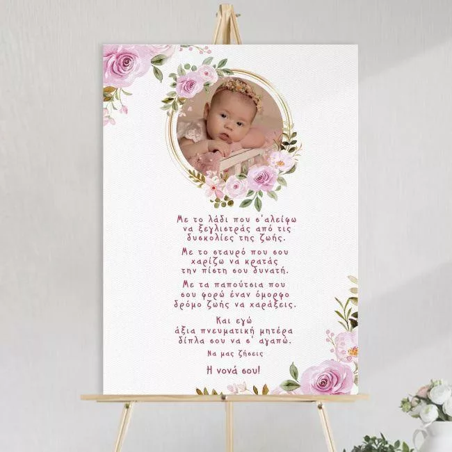 Προσωποποιημένος πίνακας υποδοχής για τη βάπτιση, με τη φωτογραφία του μωρού σας και το τρυφερό κείμενο της νονάς «Με το λάδι που σ’ αλείφω…». Επιλέξτε εκτύπωση σε καμβά, αφίσα ή πίνακα με κορνίζα.