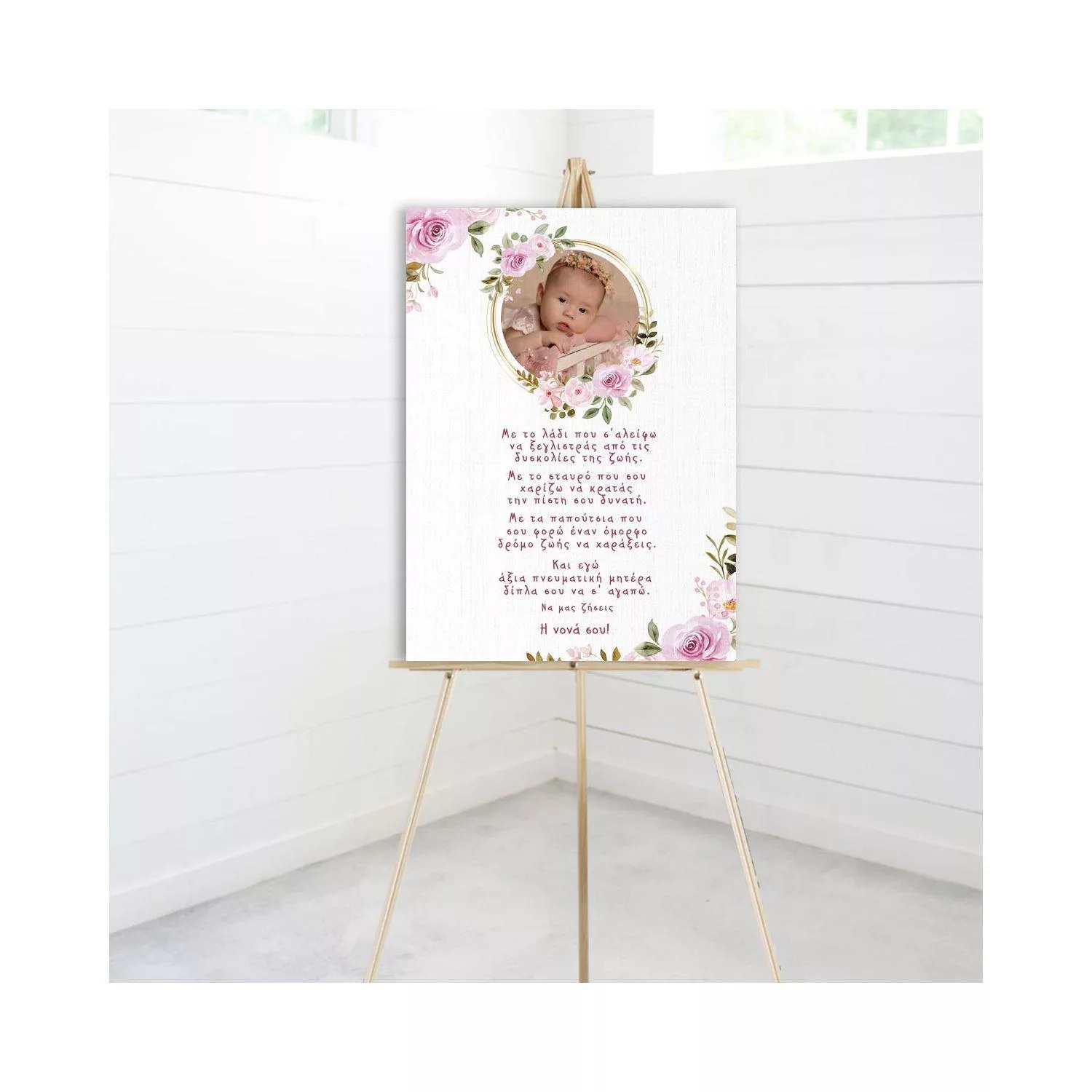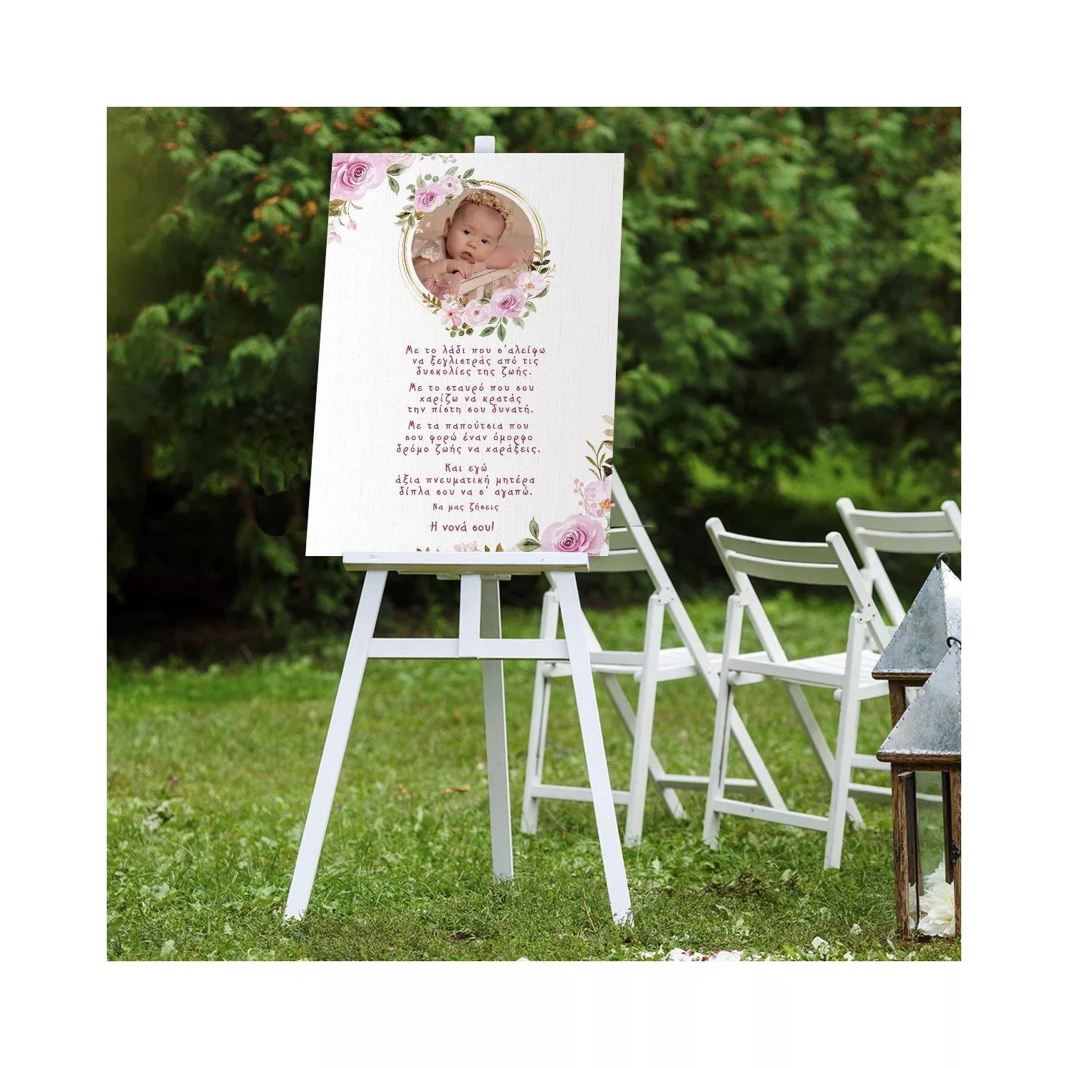 Καλωσορίστε τους καλεσμένους σας με τον πιο τρυφερό και προσωπικό τρόπο. Αυτός ο πίνακας υποδοχής συνδυάζει την αγαπημένη σας φωτογραφία με ένα κείμενο γεμάτο αγάπη, δημιουργώντας την τέλεια πρώτη εντύπωση στην είσοδο της βάπτισης.