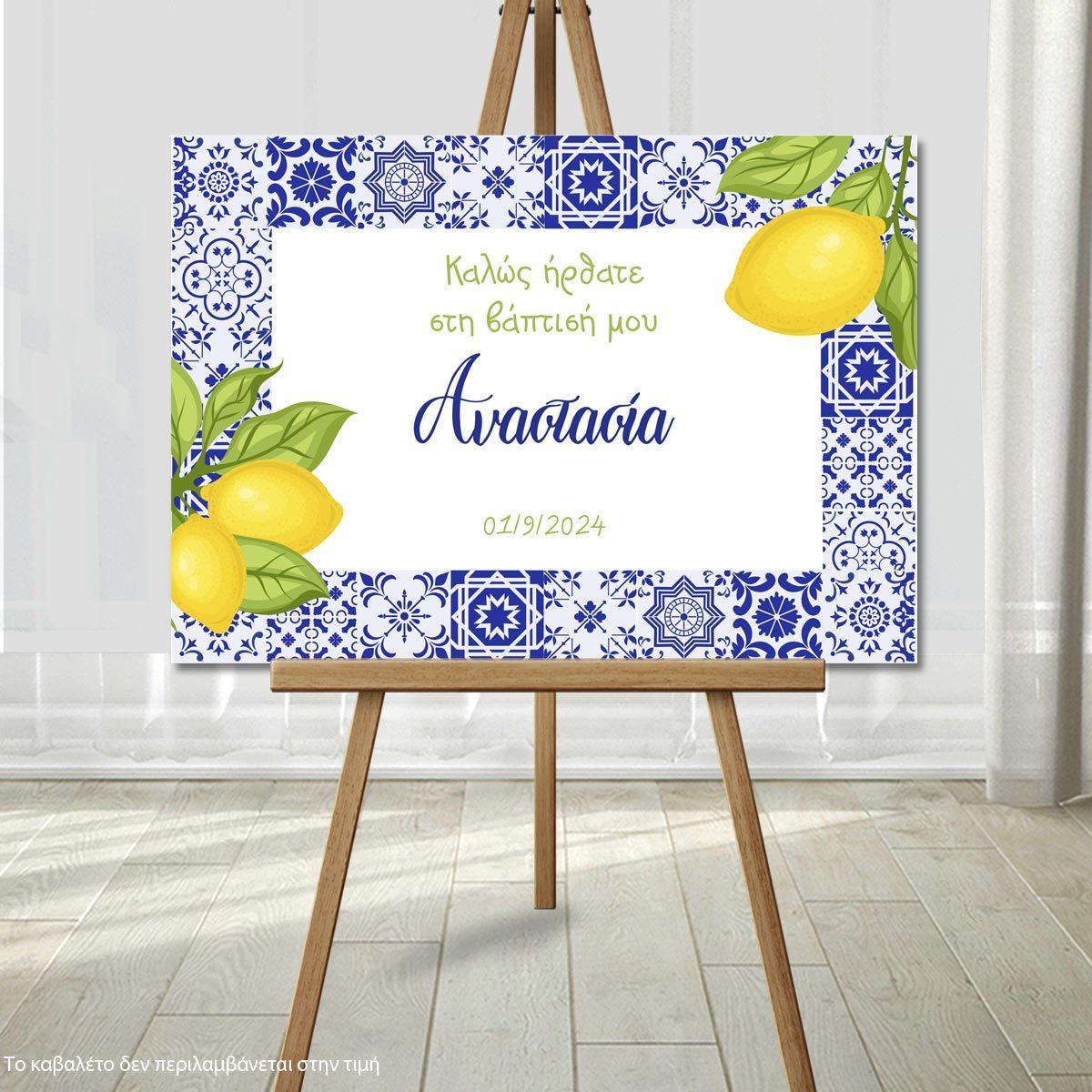 Πίνακας σε καμβά υποδοχής βάπτισης, Blue tiles lemons