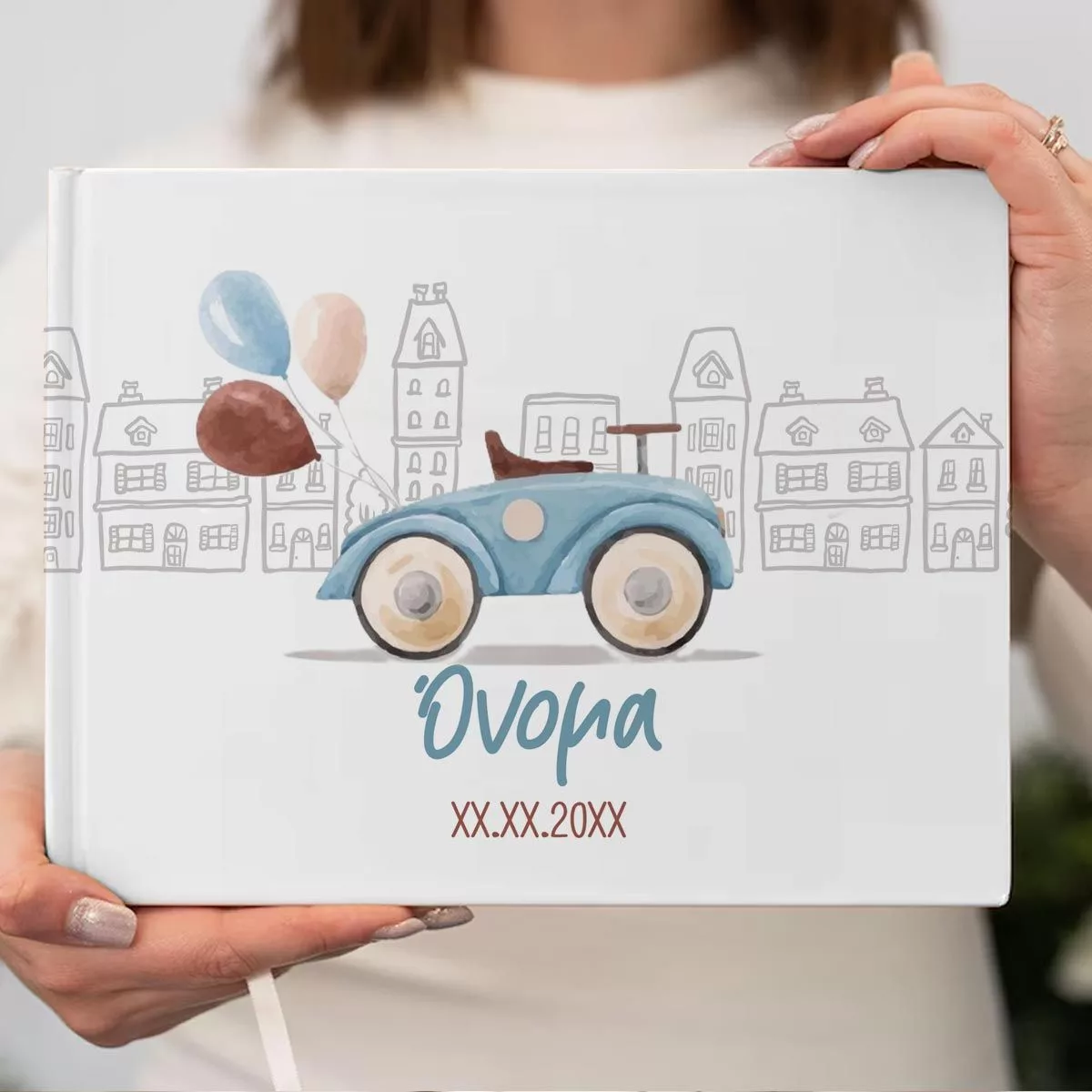 Ένα βιβλίο ευχών που ταξιδεύει τις αναμνήσεις. Το σχέδιο με το ρετρό αυτοκινητάκι και τα μπαλόνια δημιουργεί μια γλυκιά, νοσταλγική ατμόσφαιρα στο τραπέζι ευχών, προσκαλώντας τους καλεσμένους να αφήσουν το δικό τους μοναδικό αποτύπωμα.