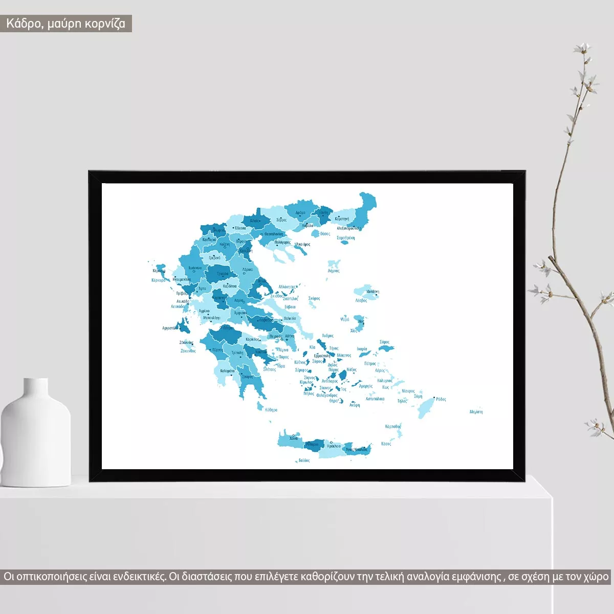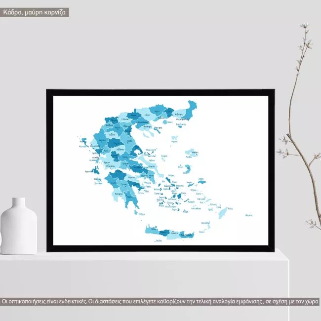 Χάρτης Ελλάδας se αποχρώσεις του μπλε, κάδρο, μαύρη κορνίζα