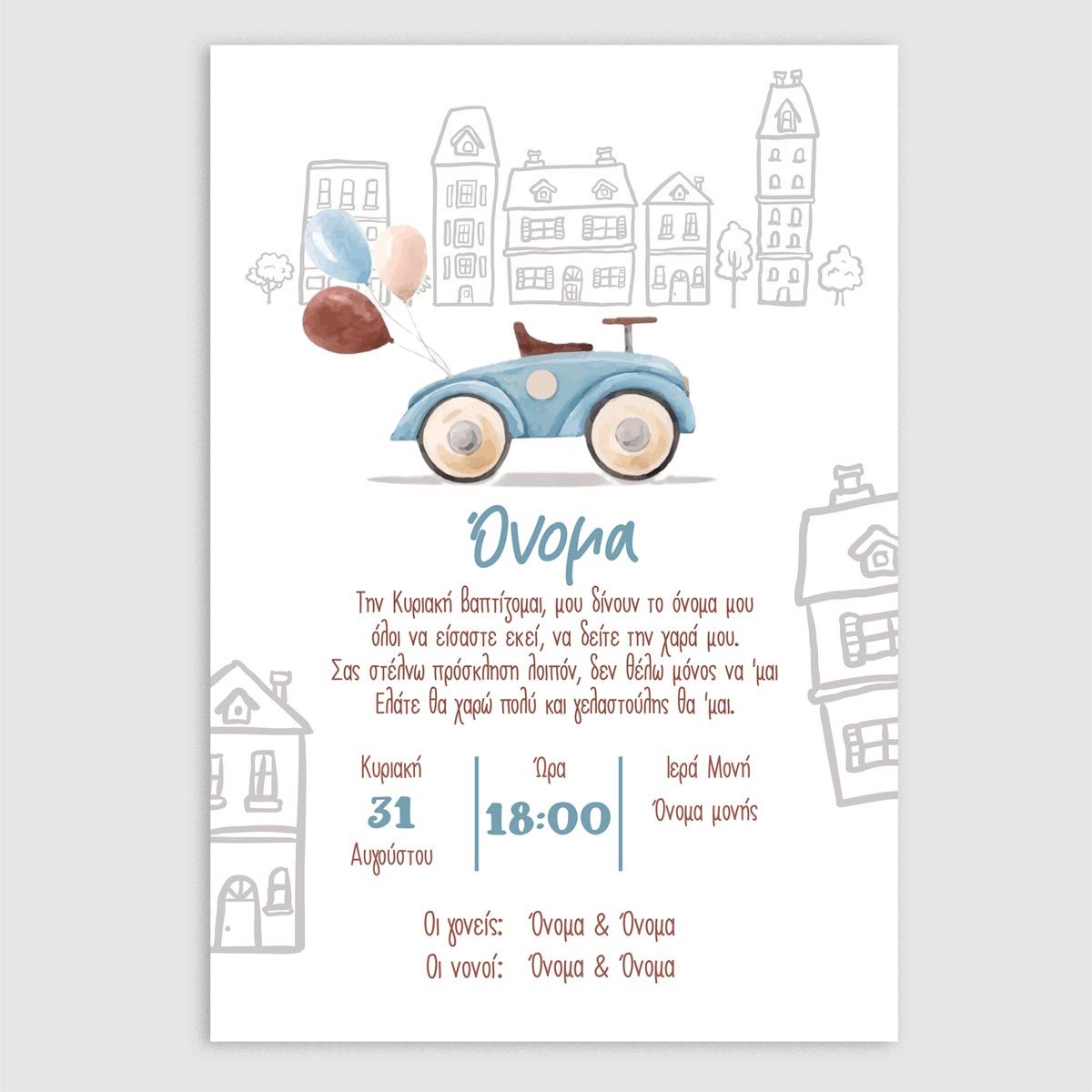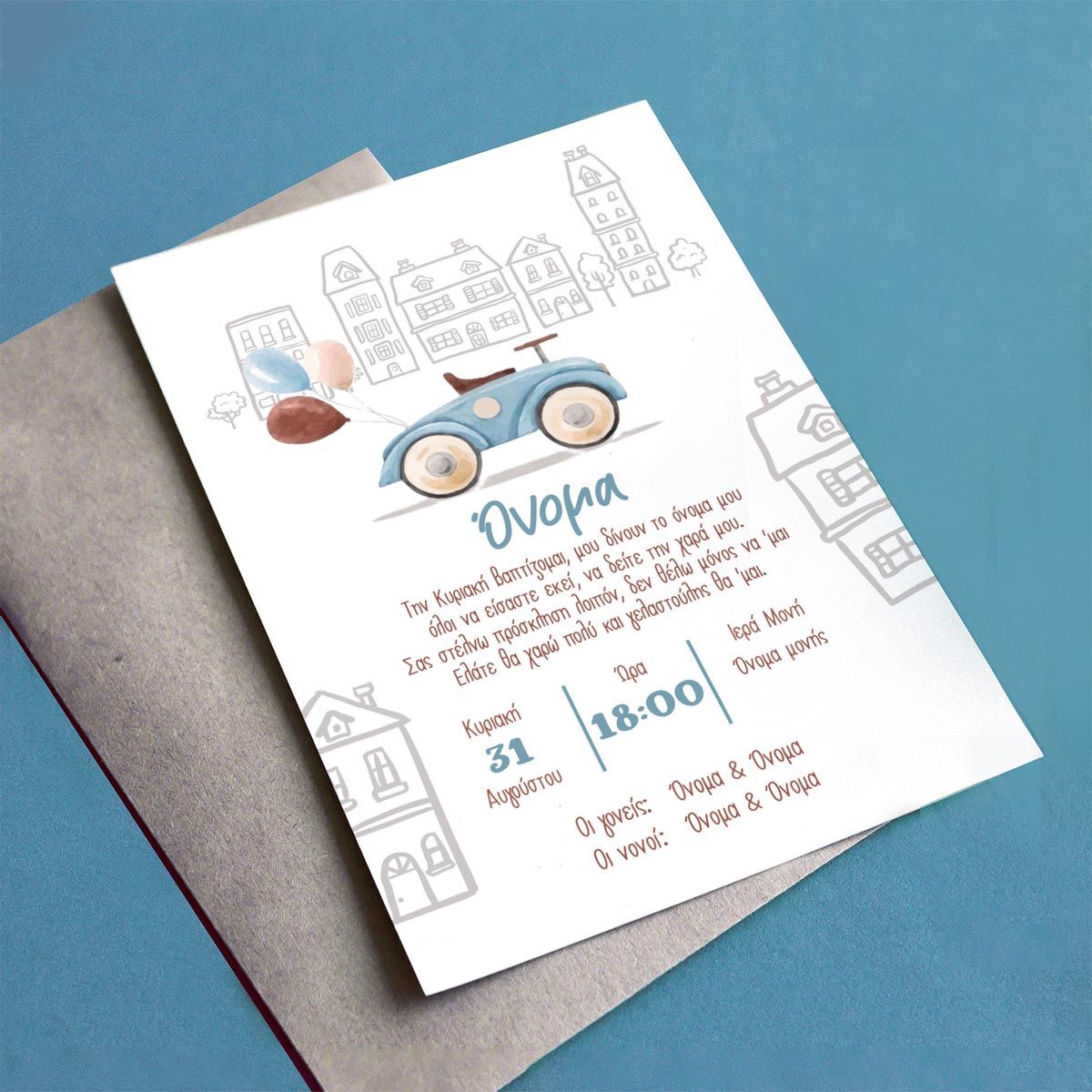 Baptism invitation, Car in the city painted